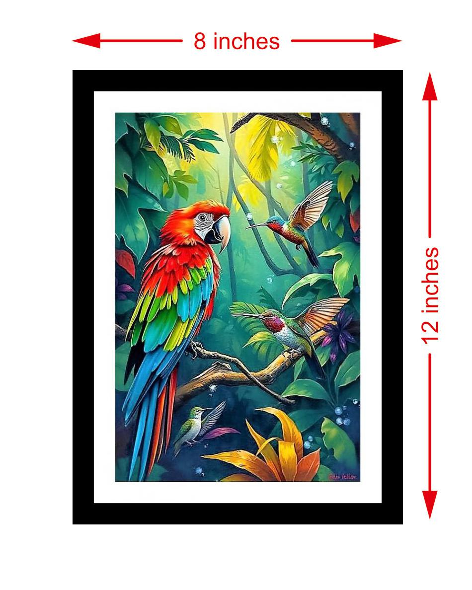 A vibrant parrot portrait bursts with life amidst a tranquil, bird-filled jungle, a stunning display of color & serenity. The reprint's colors burst with life, and the print captures every delicate detail of the stunning portrait. The reprint's striking composition breathes new life into the portrait, showcasing its beauty with stunning clarity. Versatile Decor: Ideal for enhancing the aesthetic appeal of living rooms and bedrooms Enhanced Durability: Weather-shield laminated digital print for lasting vibrancy and protection Premium Framing: Constructed with a high-quality, durable fiber frame for long-term stability Precise Dimensions: 30 cm x 20 cm x 1 cm