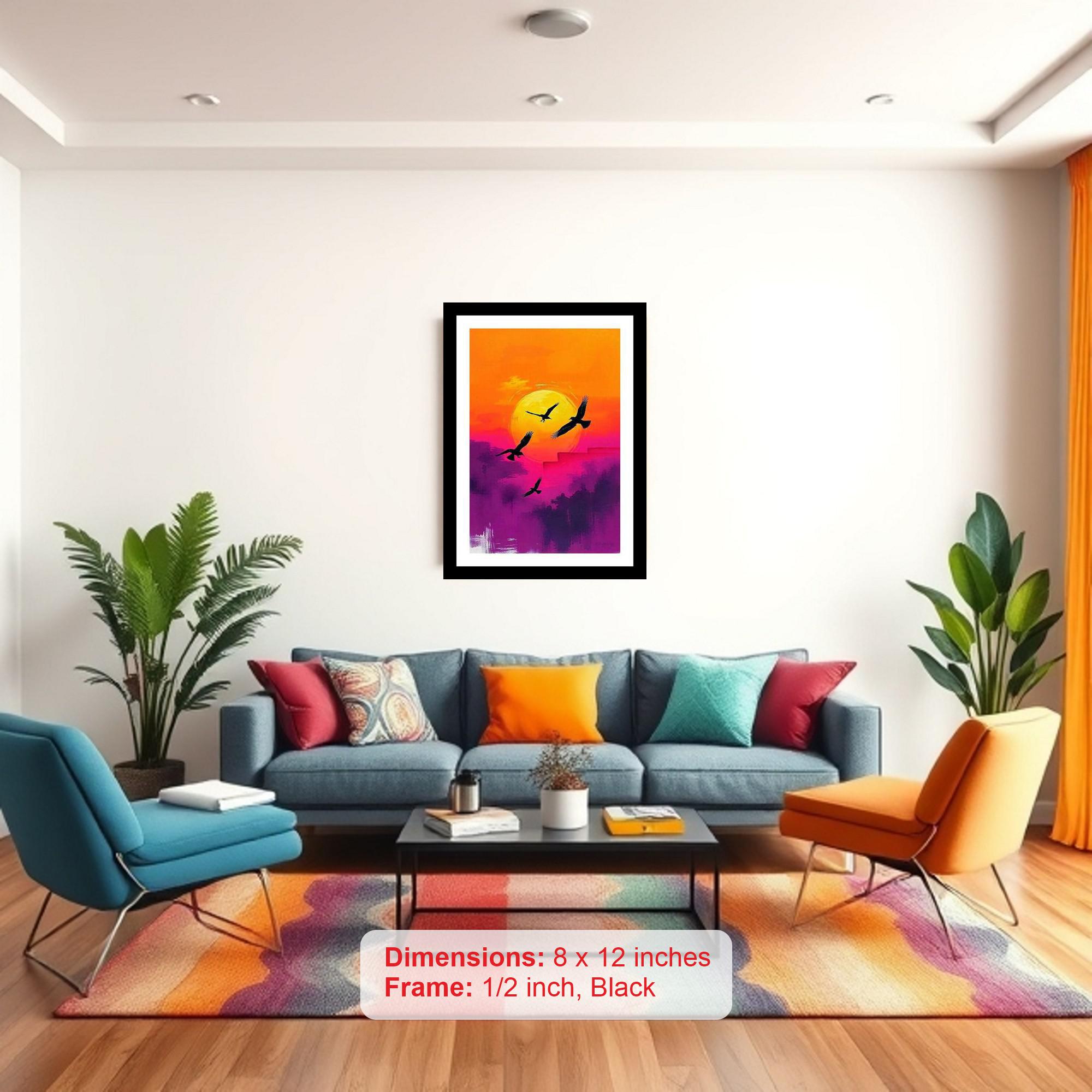 Transform your living space into a sanctuary of tranquility with our exquisitely framed digital reprint of a captivating portrait depicting beautiful birds silhouetted against a breathtaking setting sun. This stunning artwork evokes a sense of peace and freedom, capturing the ethereal beauty of nature's fleeting moments. The composition features a flock of birds gracefully soaring across the horizon, their silhouettes sharply defined against the vibrant hues of the twilight sky. The setting sun, a radiant orb of warm oranges, reds, and purples, bathes the scene in a soft, golden glow, creating a mesmerizing visual spectacle. This high-quality digital reprint faithfully reproduces the original artwork's intricate details and rich colors, ensuring a lasting impression for years to come. The image is printed on premium archival paper, guaranteeing exceptional clarity and longevity, resisting fading and yellowing over time. Expertly framed with a sophisticated and durable frame, available in various finishes to complement your existing decor, this piece adds a touch of elegance and refinement to any room. Whether displayed in your living room, bedroom, office, or hallway, this framed print will undoubtedly become a focal point, sparking conversation and inspiring a sense of wonder. Its serene and uplifting imagery makes it an ideal gift for bird lovers, nature enthusiasts, or anyone seeking to create a calming and aesthetically pleasing environment. Bring the beauty of the outdoors inside and elevate your home decor with this timeless and captivating artwork. Experience the magic of a setting sun and the graceful flight of birds every day with this beautifully framed piece, a constant reminder of the simple yet profound beauty that surrounds us.