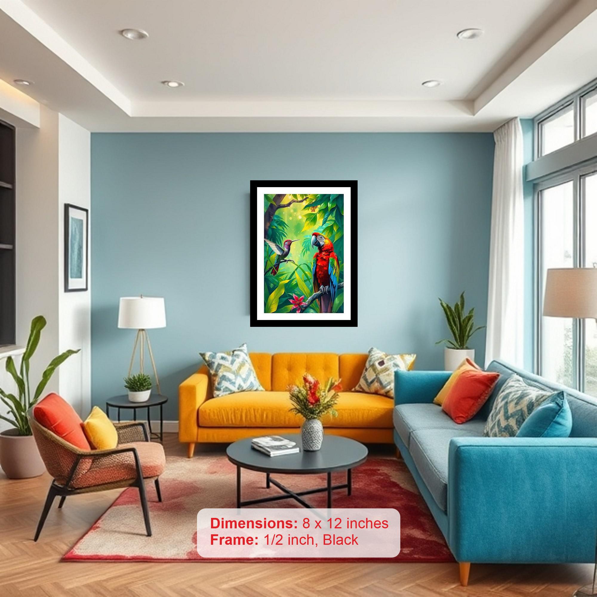 Bring the vibrant beauty of the rainforest into your home with this stunning, high-quality digital reprint of a captivating parrot portrait. This artwork depicts a magnificent parrot, resplendent in a dazzling array of colors - emerald green, fiery red, sunny yellow, and sapphire blue - perched gracefully on a branch amidst a lush jungle setting. The vibrant plumage of the parrot is exquisitely detailed, showcasing the intricate patterns and textures of each feather. Its intelligent, watchful eye seems to hold a spark of the wild, inviting you to connect with the untamed spirit of nature. The surrounding jungle is equally captivating, teeming with verdant foliage, delicate orchids, and ancient, gnarled trees. A serene river flows gently in the background, reflecting the vibrant colors of the sky and adding a sense of depth and tranquility to the scene. This meticulously crafted digital reprint captures the essence of the original artwork, preserving its rich colors and intricate details with exceptional clarity. The print is professionally framed in a classic black frame, adding a touch of elegance and sophistication while protecting the artwork from dust and damage. The frame is carefully chosen to complement the artwork, enhancing its visual impact and ensuring it seamlessly integrates into any home decor. This framed parrot portrait is more than just a piece of art; it's a window into a world of natural beauty, a reminder of the importance of preserving our planet's biodiversity, and a vibrant addition to any living room, bedroom, office, or hallway. It is a perfect gift for bird lovers, nature enthusiasts, art collectors, or anyone who appreciates the beauty and wonder of the natural world. The ready-to-hang design allows for easy installation, allowing you to enjoy this captivating artwork in your home within minutes. Let this breathtaking parrot portrait transform your space into a sanctuary of color, tranquility, and natural beauty.