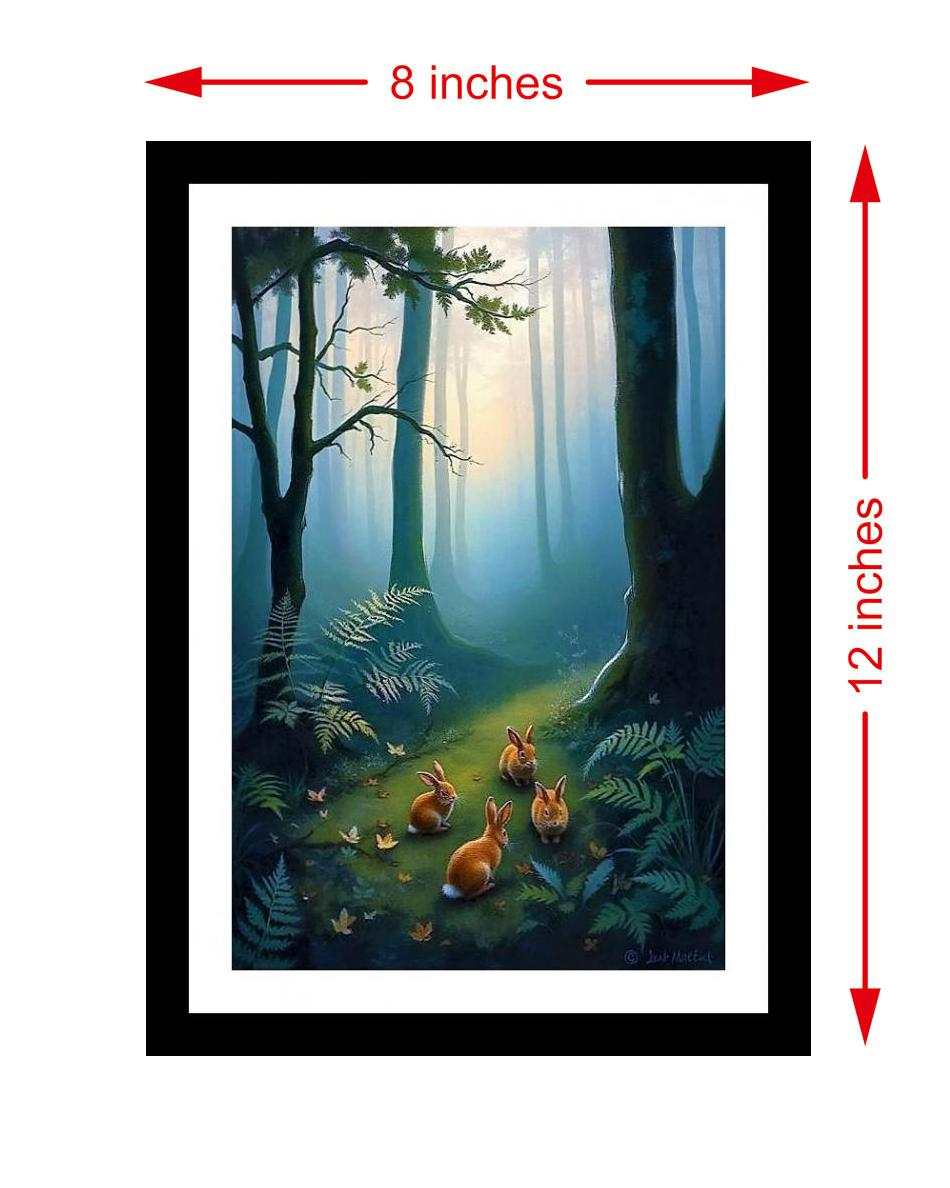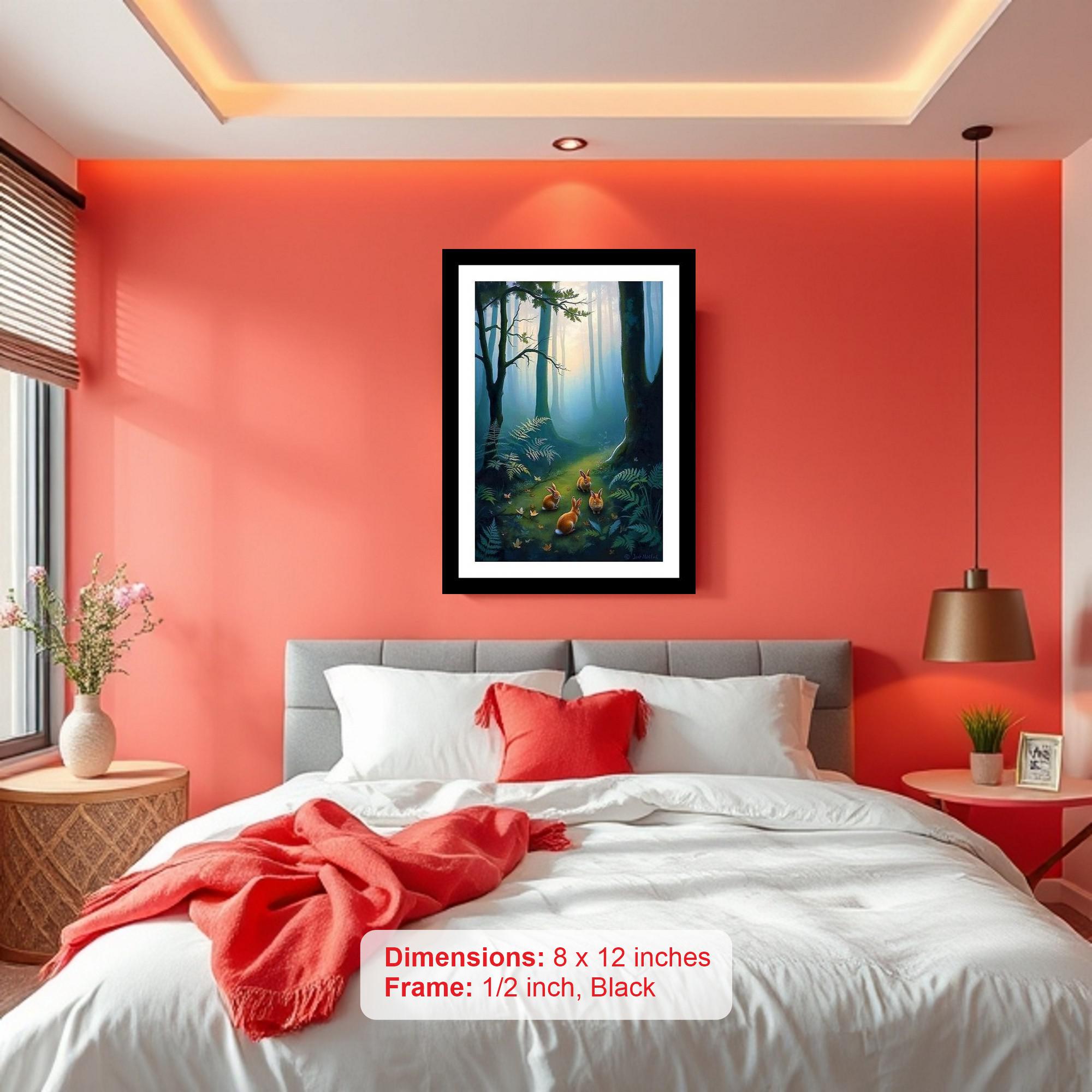 Envelop your space in the tranquil beauty of nature with this elegant, framed digital reprint. This captivating portrait evokes a sense of serenity and magic, depicting a misty woodland scene bathed in the warm hues of autumn. Delicately rendered rabbits and bunnies frolic amidst fallen leaves and lush ferns, creating a charming and inviting atmosphere. The classic black frame adds a touch of sophistication, making it a perfect addition to any home decor style. Bring the peaceful essence of the forest indoors and transform your living room, bedroom, or office into a sanctuary of calm with this exquisite piece of art.