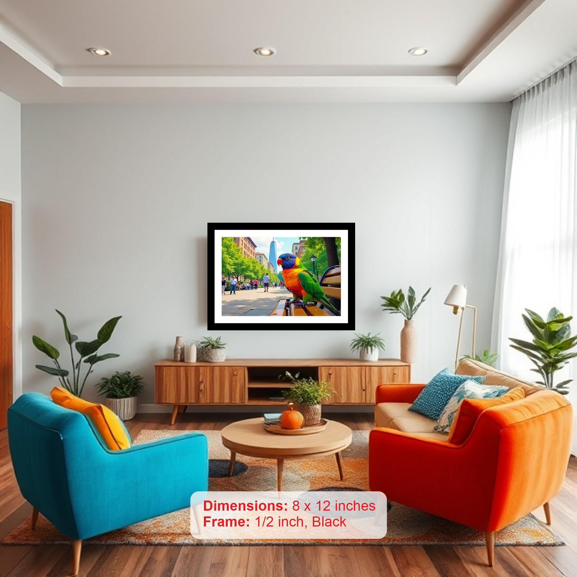 Elevate your home decor with this captivating, elegantly framed digital reprint showcasing a vibrant parrot, perhaps a rainbow lorikeet, amidst an unexpected urban scene. The artwork blends the wild beauty of a tropical bird with the structured environment of a city park. Imagine a colorful parrot perched near a park bench, with blurred figures of people strolling along the street in the background. Towering trees provide a natural canopy, framing a glimpse of a classic city building. The stark contrast between the parrot's exotic plumage and the familiar cityscape creates a compelling visual narrative, making it a perfect conversation starter. The classic black frame complements the artwork's sophisticated yet playful nature, adding a touch of refinement to any room. Whether you're a bird lover, an admirer of urban art, or simply seeking a unique piece to enrich your living space, this framed reprint offers a timeless appeal and will seamlessly integrate into any interior design style.