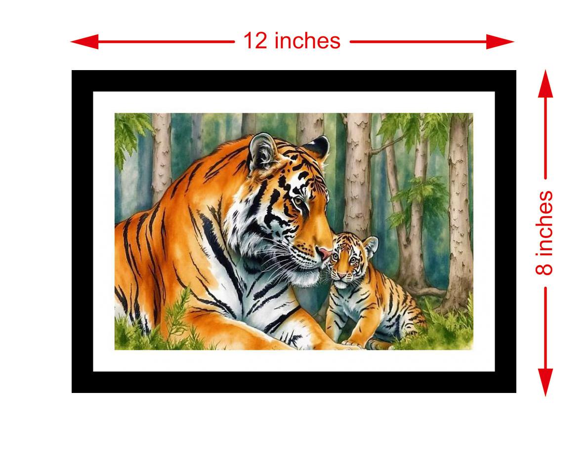 A heart-melting portrait of maternal love: a tigress fiercely protects her cub amidst a lush, breathtaking jungle. The colors pop and the detail is stunning - a truly gorgeous reproduction that honors the original portrait. The digital reprint boasts a striking composition, faithfully capturing the portrait's original beauty in vibrant detail. Versatile Decor: Ideal for enhancing the aesthetic appeal of living rooms and bedrooms Enhanced Durability: Weather-shield laminated digital print for lasting vibrancy and protection Premium Framing: Constructed with a high-quality, durable fiber frame for long-term stability Precise Dimensions: 30 cm x 20 cm x 1 cm