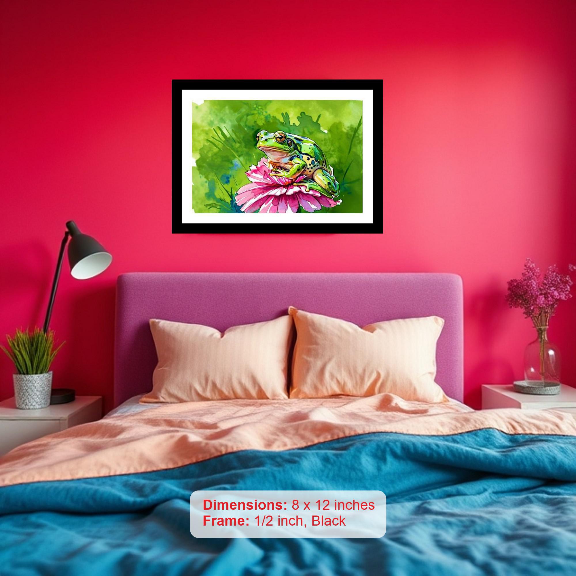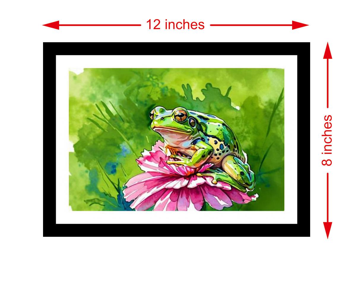 A vibrant green frog finds serene beauty atop a delicate pink flower in this captivating artwork. The colors are vibrant and the print captures every delicate detail of the original portrait. The digital reprint boasts a striking composition, breathing new life into the portrait's inherent beauty. Versatile Decor: Ideal for enhancing the aesthetic appeal of living rooms and bedrooms Enhanced Durability: Weather-shield laminated digital print for lasting vibrancy and protection Premium Framing: Constructed with a high-quality, durable fiber frame for long-term stability Precise Dimensions: 30 cm x 20 cm x 1 cm