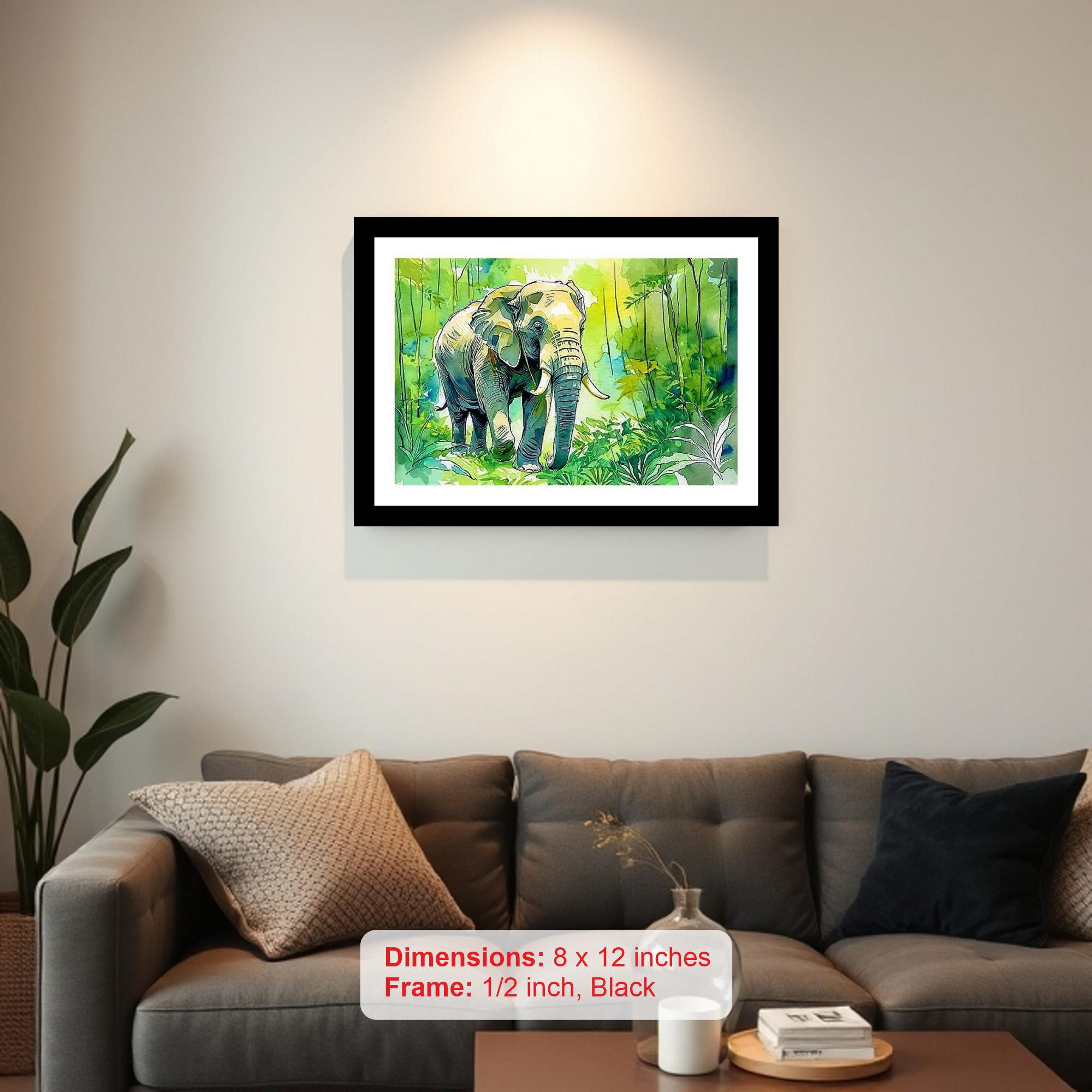 Capture the untamed beauty of the natural world with our elegantly framed digital reprint, showcasing a majestic elephant as it strides purposefully through a lush and vibrant jungle. This striking artwork, meticulously recreated to preserve the original's intricate details, features a powerful elephant rendered with remarkable realism, its textured skin and graceful movements brought to life against a backdrop of dense, verdant foliage. The vivid greens and earthy tones of the jungle create a captivating contrast with the elephant's imposing figure, drawing the viewer into a scene of serene power and untamed wilderness. Encased in a classic black frame, this piece exudes timeless sophistication, adding a touch of refined artistry to any living room, bedroom, office, or hallway. Its high-quality materials and durable construction ensure lasting beauty, making it a cherished addition to your home decor or a thoughtful gift for nature enthusiasts and art lovers alike. Bring the majesty of the animal kingdom into your space and create a captivating focal point with this exquisite elephant portrait.