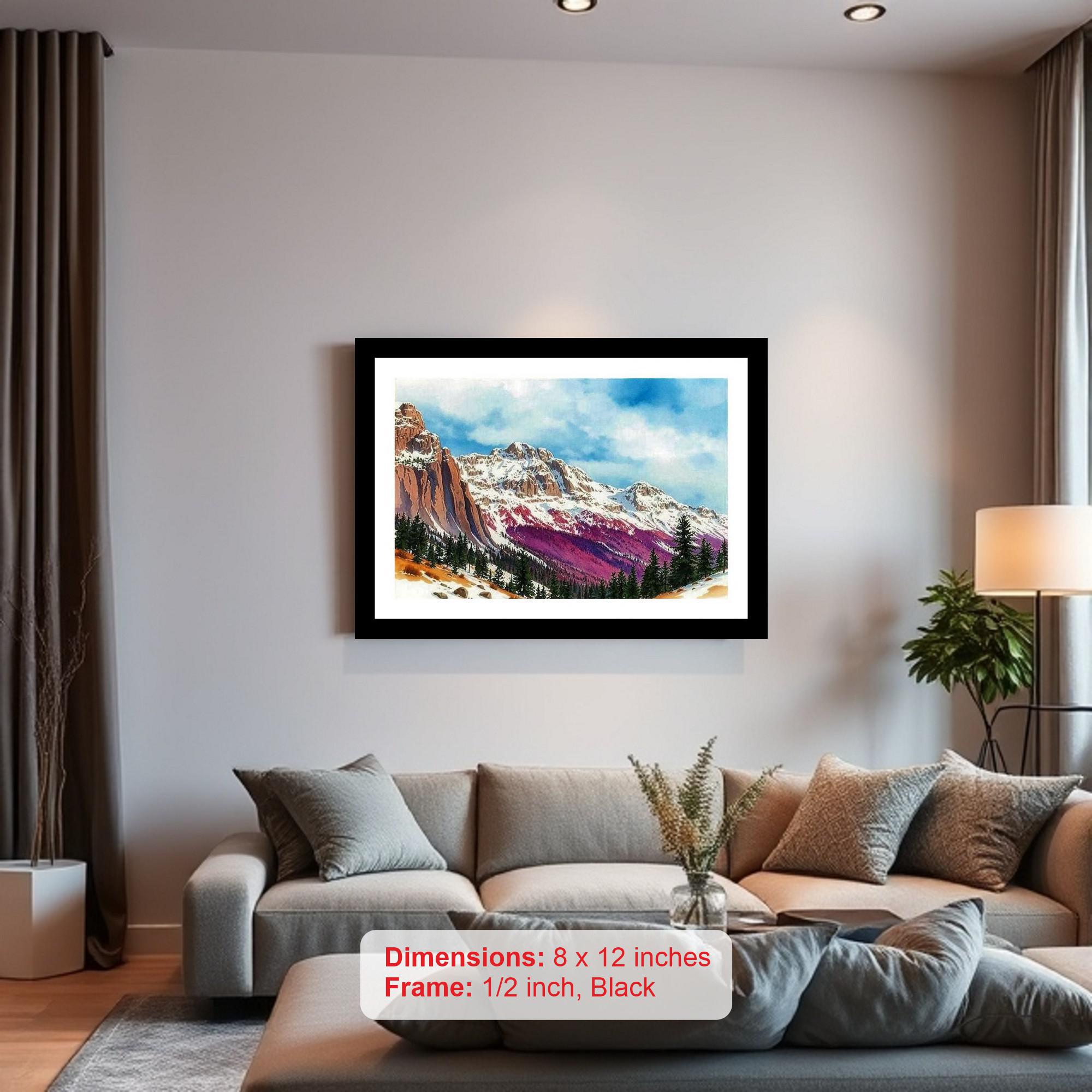 Elevate your home decor with this stunning, digitally reprinted portrait of a majestic snow-capped mountain range, elegantly framed in classic black. This captivating artwork showcases the awe-inspiring beauty of nature, where towering peaks rise dramatically beneath a vibrant and dynamic sky. The pristine white snow blankets the highest elevations, contrasting beautifully with the deep greens of the evergreen trees that dot the lower slopes. This piece evokes a sense of tranquility and grandeur, bringing the serenity of the mountains into your living space. The high-quality digital reprint captures the intricate details and rich colors of the original artwork, ensuring a visually striking and lasting impression. The classic black frame adds a touch of sophistication and complements any interior design style, making it a perfect addition to your living room, bedroom, office, or entryway. This mountain landscape print serves as a constant reminder of the power and beauty of the natural world, inspiring a sense of peace and wonder. It also makes a thoughtful and impressive gift for nature lovers, art enthusiasts, or anyone seeking to add a touch of elegance and serenity to their home.