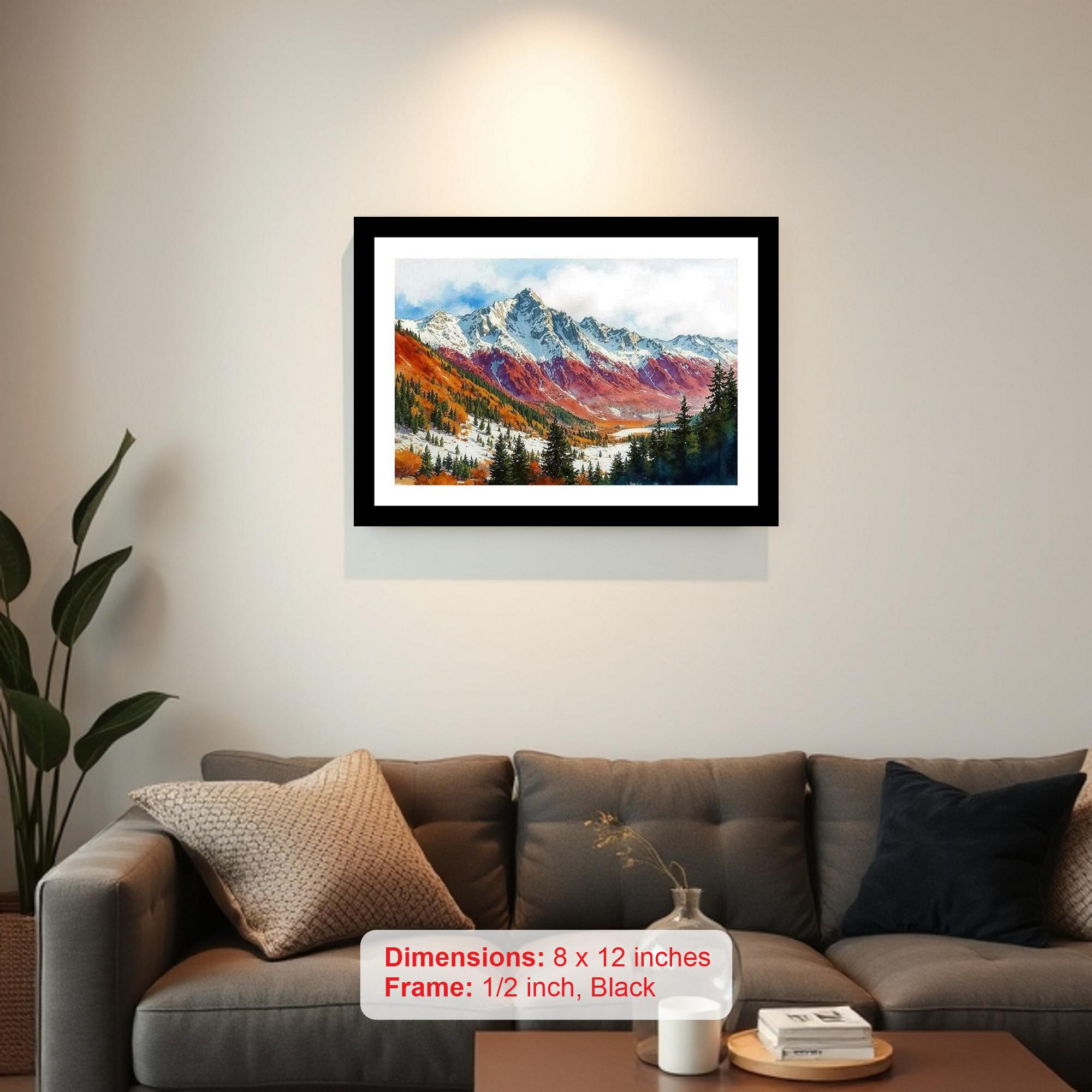 Elevate your home decor with this timeless black framed digital reprint, showcasing a breathtaking autumnal mountain landscape. This elegant piece captures the majestic beauty of snow-capped peaks contrasting with the vibrant tapestry of red and gold foliage, creating a stunning visual experience. The classic black frame adds a touch of sophistication, making it a versatile addition to any living room, bedroom, office, or hallway. This artwork is a perfect way to bring the serenity of nature indoors, offering a tranquil and visually appealing focal point for your space. The high-quality digital reprint ensures crisp details and rich colors, allowing you to enjoy the beauty of the original landscape for years to come. It's also a thoughtful gift for art lovers, nature enthusiasts, or anyone seeking a touch of elegance and natural beauty in their home.