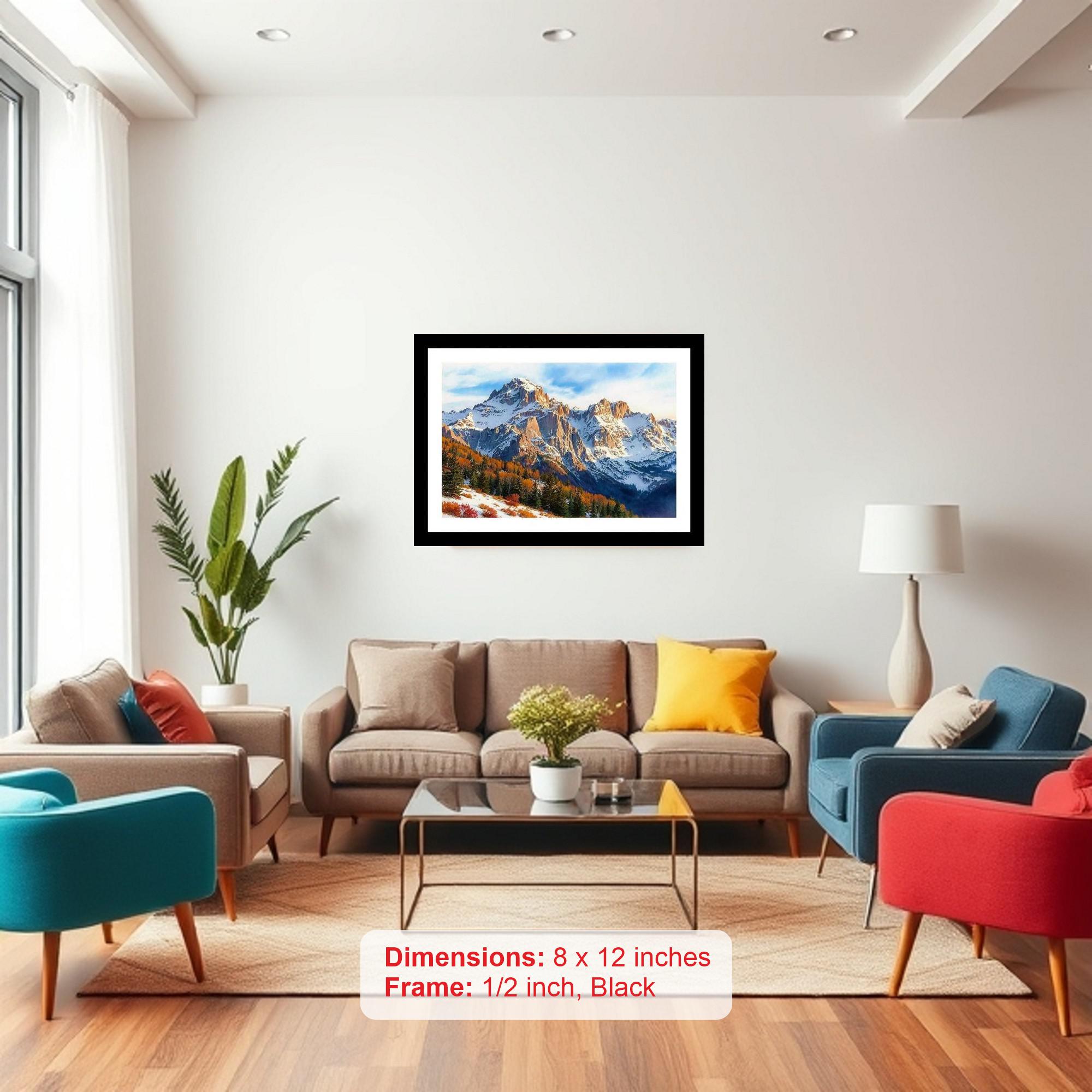 Capture the breathtaking beauty of the changing seasons with this elegant, digitally reprinted portrait showcasing nature's grandeur. Witness the vibrant hues of autumn as they sweep across the foothills in a stunning display of golds, reds, and oranges, a painterly masterpiece brought to life. Against this tapestry of autumnal colors, snow-capped peaks rise majestically in the distance, their crisp white summits adding a touch of serenity and timelessness to the scene. This artwork, framed in a classic black finish, exudes sophistication and will effortlessly complement any interior decor, from traditional to modern. It's more than just a picture; it's an invitation to immerse yourself in the tranquility of nature, a daily reminder of the beauty that surrounds us, and a conversation starter that will captivate guests. Add a touch of elegance and natural wonder to your home or office with this captivating piece.