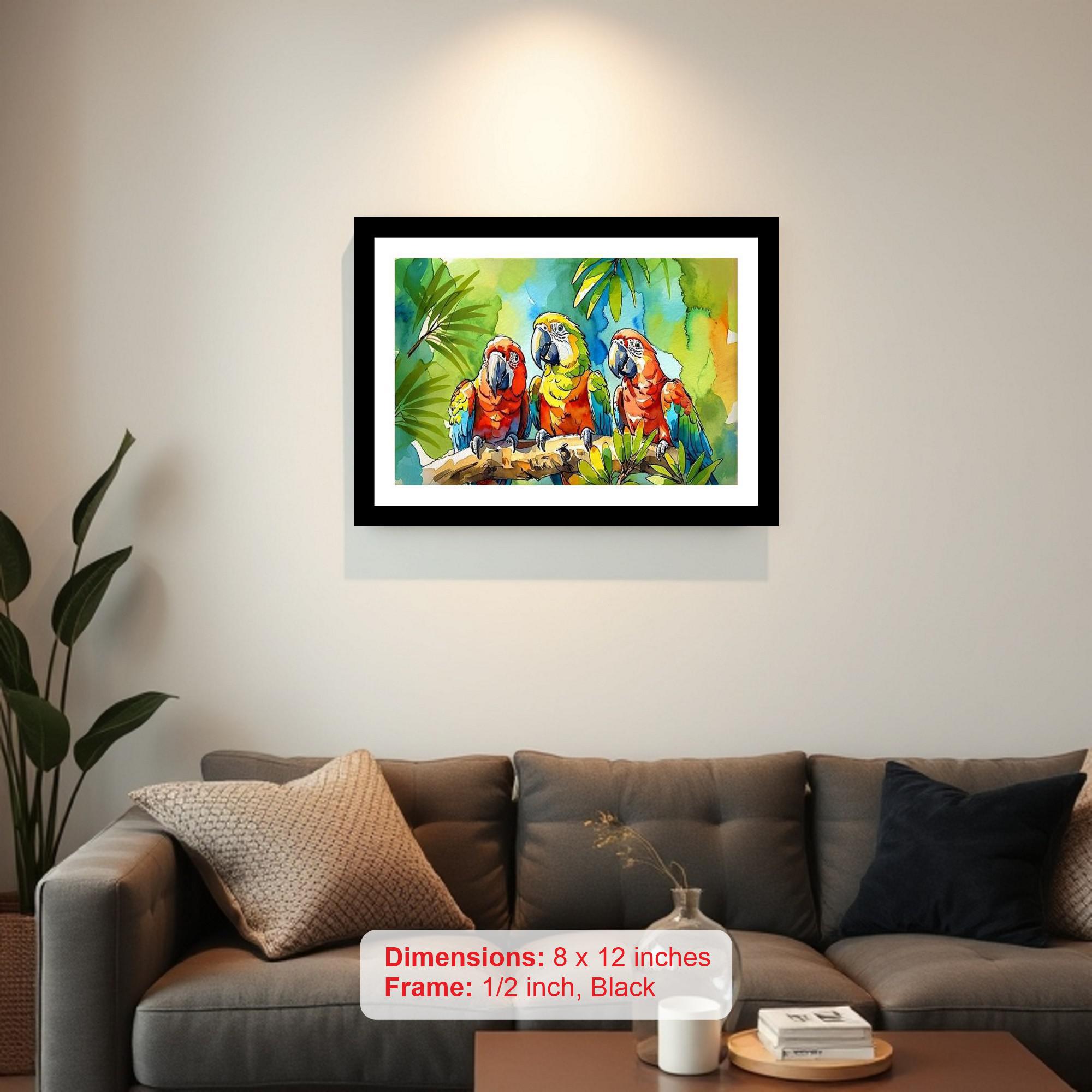 Tropical Macaw Trio Portrait: Vibrant Wall Art. Photo Frame With Photo, Wall Hanging Art, Wall Decor, Home Decor, Picture Frame | Size: 8 x 12 inches