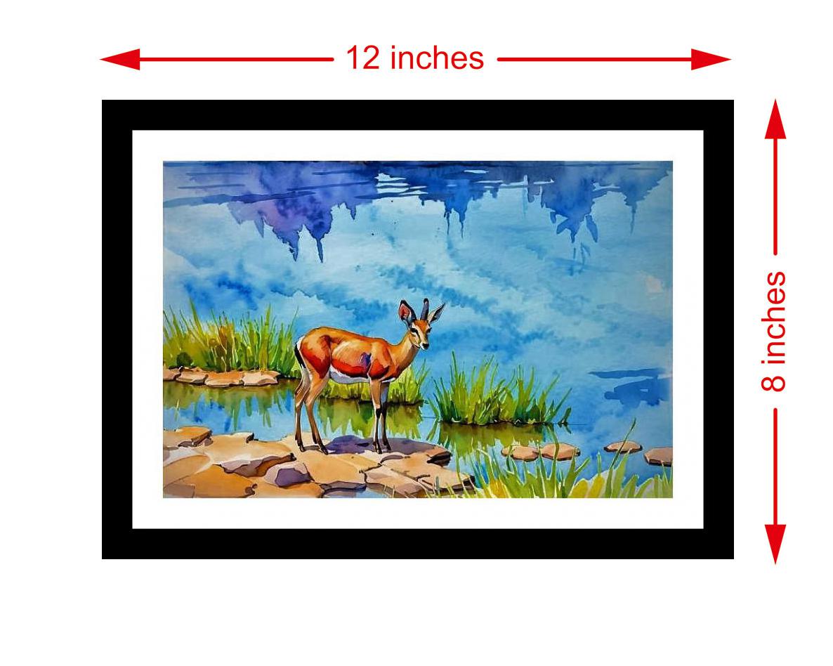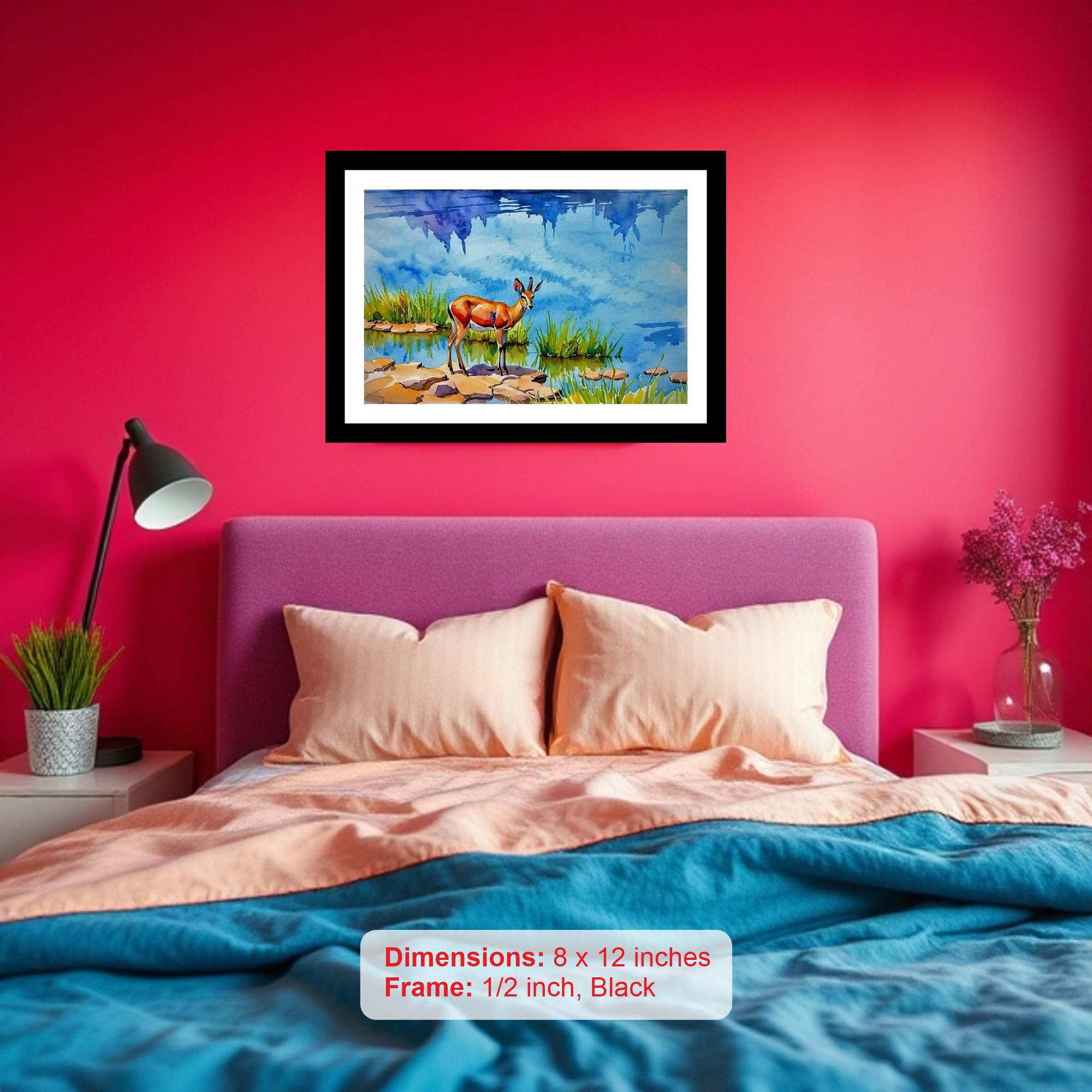 The serene antelope and tranquil water create a captivatingly graceful scene. The colors pop, the detail is stunning - a vibrant, faithful reproduction that truly honors the original portrait. The digital reprint boasts a striking composition, faithfully capturing the portrait's beauty and depth in crisp detail. Versatile Decor: Ideal for enhancing the aesthetic appeal of living rooms and bedrooms Enhanced Durability: Weather-shield laminated digital print for lasting vibrancy and protection Premium Framing: Constructed with a high-quality, durable fiber frame for long-term stability Precise Dimensions: 30 cm x 20 cm x 1 cm