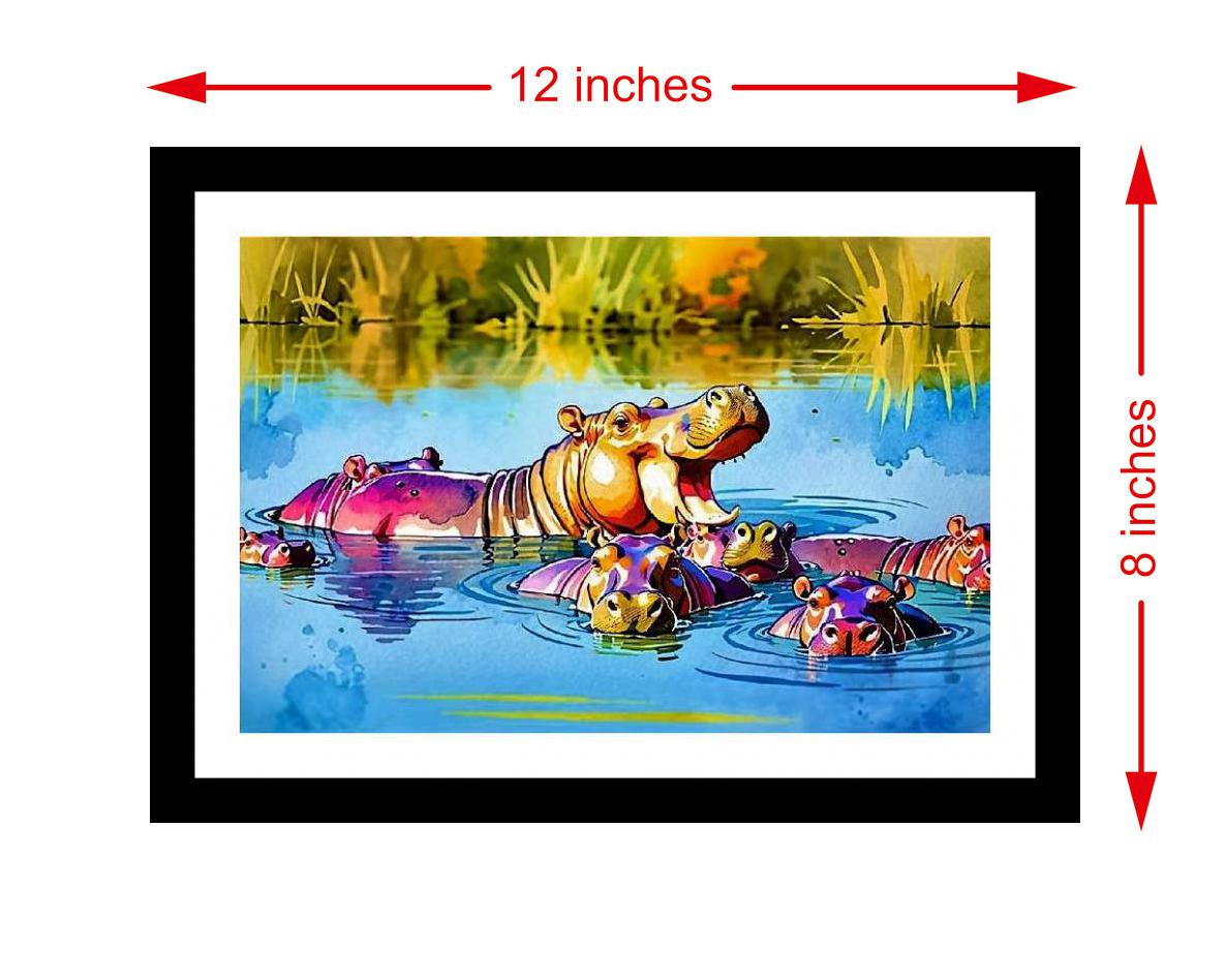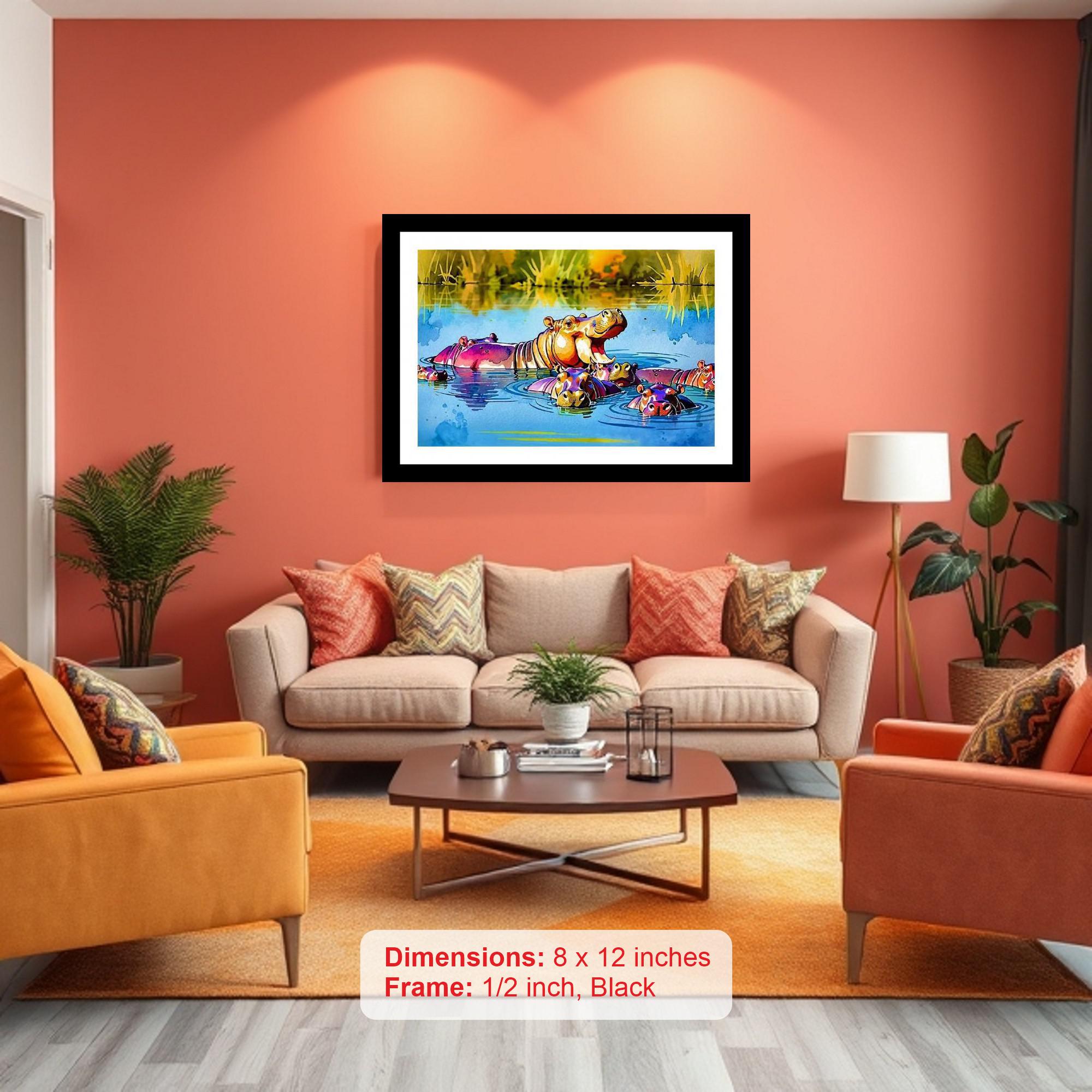 Hippo Family Dip: Vibrant Wall Art. Wall Art, Interior Accents, Framing Solutions, Residential/Commercial Decor, Premium Gifts | Size: 8 x 12 inches