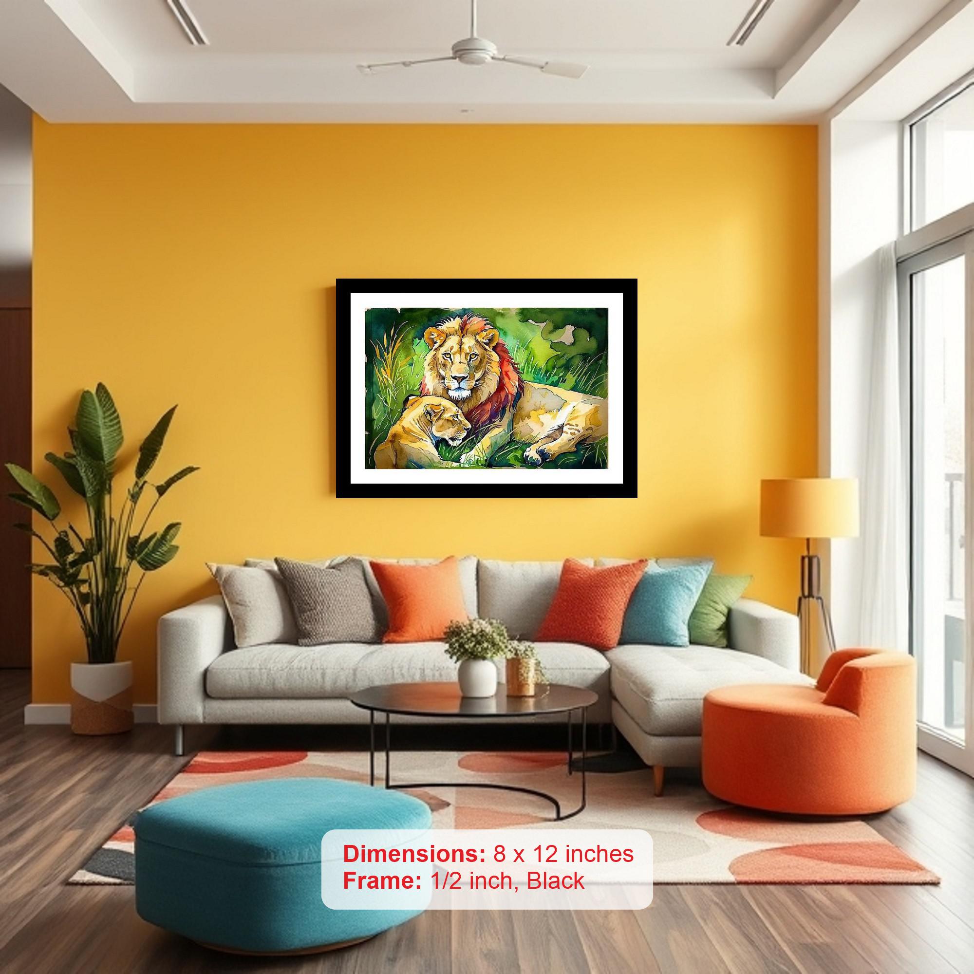 Bring the raw beauty and serene power of the African savanna into your home with this stunning digital reprint. Featuring a majestic lion and lioness resting peacefully amidst the tall grass, this portrait captures a tender moment of tranquility within the wild. The classic black frame adds a touch of timeless elegance, making it a perfect addition to any living room, bedroom, office, or study. The high-quality digital printing ensures exceptional detail and vibrant colors that will last for years to come. This artwork is not just a decoration; it's a statement piece that evokes feelings of strength, grace, and the captivating spirit of the natural world. It is a wonderful piece to bring natural tones and an elegant look to any space. Whether you're an animal lover, an admirer of African wildlife, or simply seeking a sophisticated piece of art to enhance your decor, this framed print is sure to impress. It also makes a thoughtful and memorable gift for birthdays, housewarmings, or any special occasion. Add a touch of wild beauty to your space with this captivating piece.