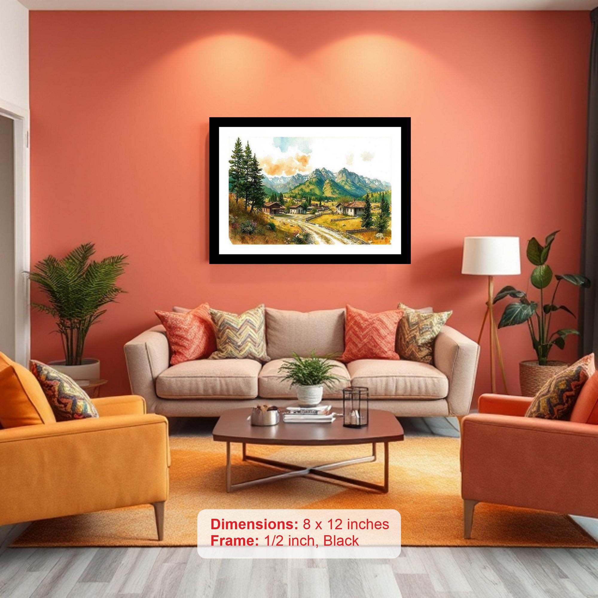 Adorn your home with timeless elegance and breathtaking scenery with our classic black Framed Digital Reprint. This stunning piece depicts a picturesque mountain village nestled serenely in a verdant valley. A winding path, bathed in soft light, invites the eye to journey deeper into the scene, eventually leading towards the majestic, snow-capped peaks that dominate the horizon. The print captures the tranquility and grandeur of nature, bringing a sense of peace and wonder to any room. Encased in a sleek, classic black frame, this artwork adds a touch of sophistication to any decor, from traditional to modern. The high-quality digital reprint ensures vibrant colors and sharp details, faithfully recreating the beauty of the original scene. Perfect for living rooms, bedrooms, offices, or hallways, this framed print is more than just wall decor; it's a window to a serene and inspiring landscape, a constant reminder of the beauty and majesty of the natural world. It's a perfect gift for art lovers, nature enthusiasts, or anyone who appreciates a touch of classic charm.