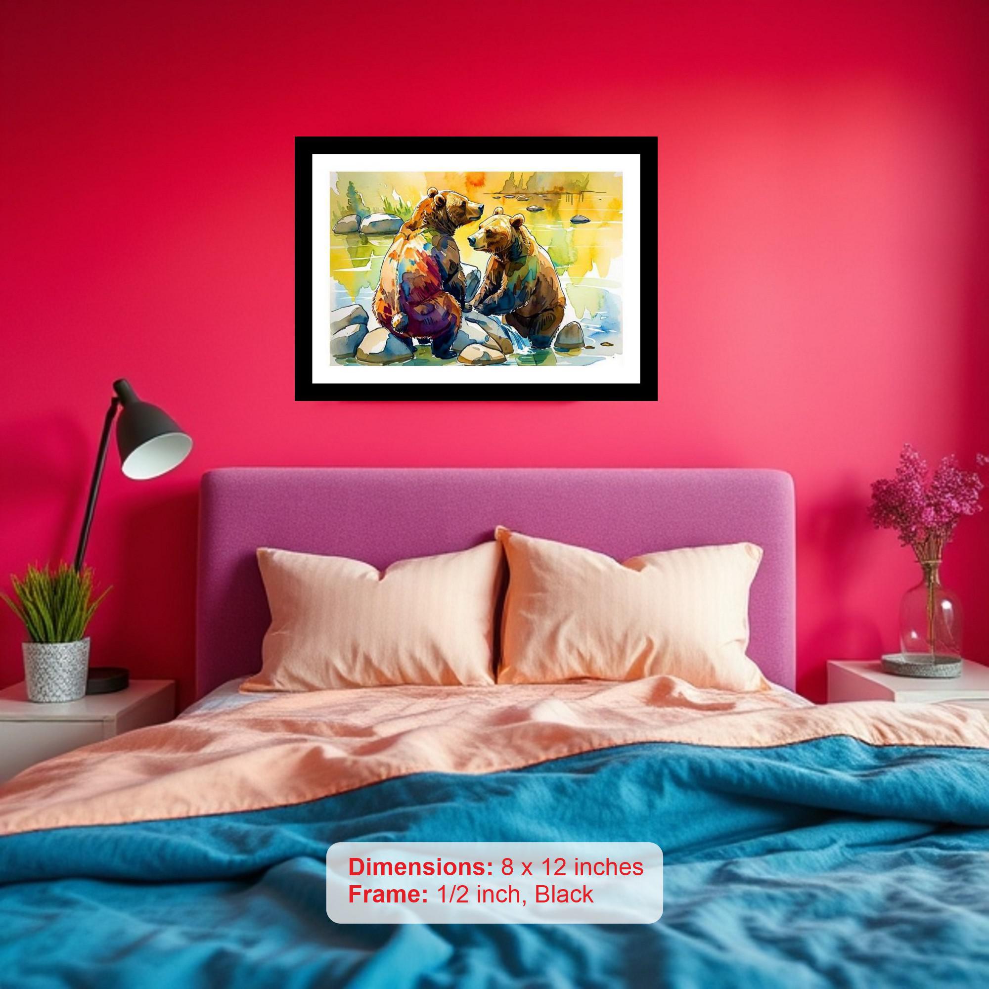 Capture the serene beauty of the wild with this elegantly framed digital reprint of a captivating portrait depicting two grizzly bears enjoying a tranquil moment by a serene stream. This stunning piece of artwork brings the majesty and peacefulness of nature into your home or office. The image showcases the powerful yet gentle nature of these magnificent creatures as they share a quiet interlude in their natural habitat. The classic black frame adds a touch of sophistication and complements any decor style, making it a versatile addition to your living room, bedroom, study, or entryway. Printed with high-quality archival inks on premium paper, this reprint ensures vibrant colors and exceptional detail that will last for years to come. The artwork arrives ready to hang, making it easy to instantly transform your space. Bring the calming presence of the wilderness indoors and create a focal point that sparks conversation and inspires a sense of wonder with this timeless piece of art.