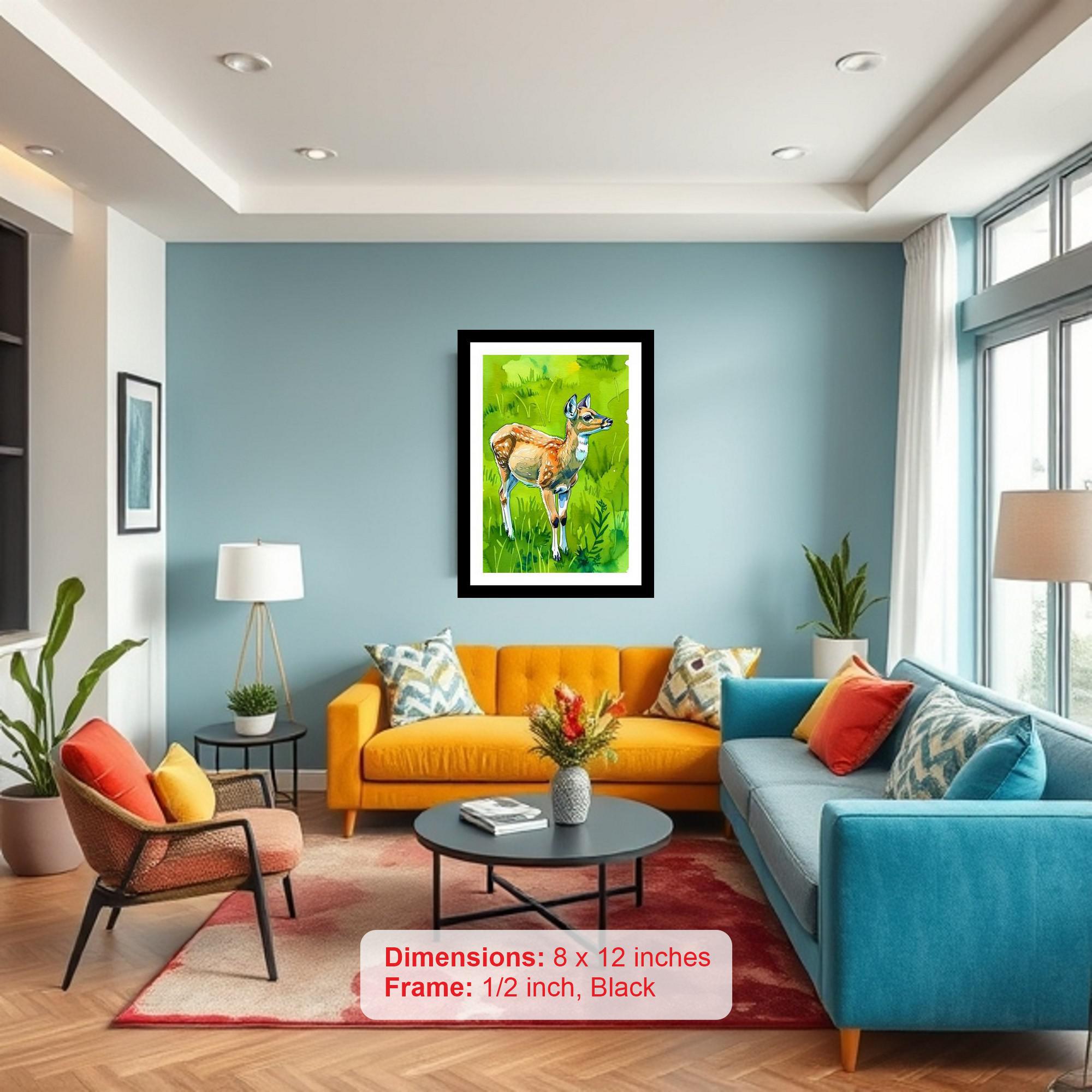 Capture the serene beauty of nature with our elegantly framed digital reprint featuring a graceful spotted fawn standing amidst a vibrant green meadow. This classic artwork is meticulously reproduced to showcase the delicate details of the fawn's coat and the lush textures of the surrounding landscape. The black frame adds a touch of timeless sophistication, making it a perfect addition to any home decor style, from rustic to contemporary. This piece offers a captivating glimpse into the tranquility of the wild, bringing a sense of peace and natural wonder to your living space. Ideal for adding a touch of elegance to your living room, bedroom, office, or hallway, this framed print is a thoughtful gift for nature lovers, art enthusiasts, or anyone seeking a calming and visually appealing accent piece. Enjoy the beauty of wildlife art with this high-quality, ready-to-hang framed print.