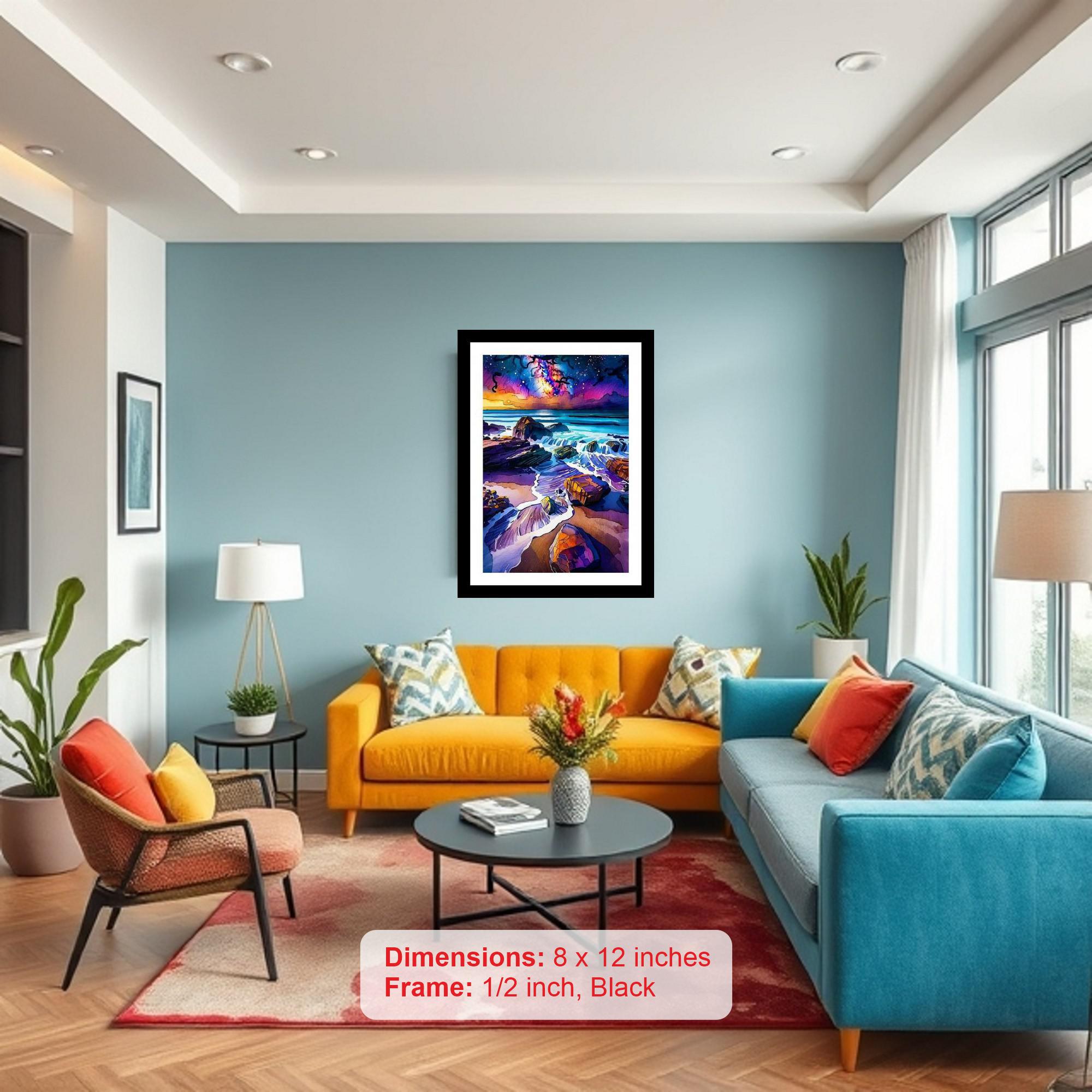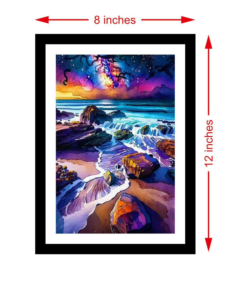 Cosmic sunset on a rocky shore, ocean waves alive with otherworldly light. A breathtaking masterpiece! The reprint captures the portrait's original vibrancy and detail with flawless color and print clarity. The digital reprint boasts a strikingly composed portrait; a masterclass in color and light. Versatile Decor: Ideal for enhancing the aesthetic appeal of living rooms and bedrooms Enhanced Durability: Weather-shield laminated digital print for lasting vibrancy and protection Premium Framing: Constructed with a high-quality, durable fiber frame for long-term stability Precise Dimensions: 30 cm x 20 cm x 1 cm