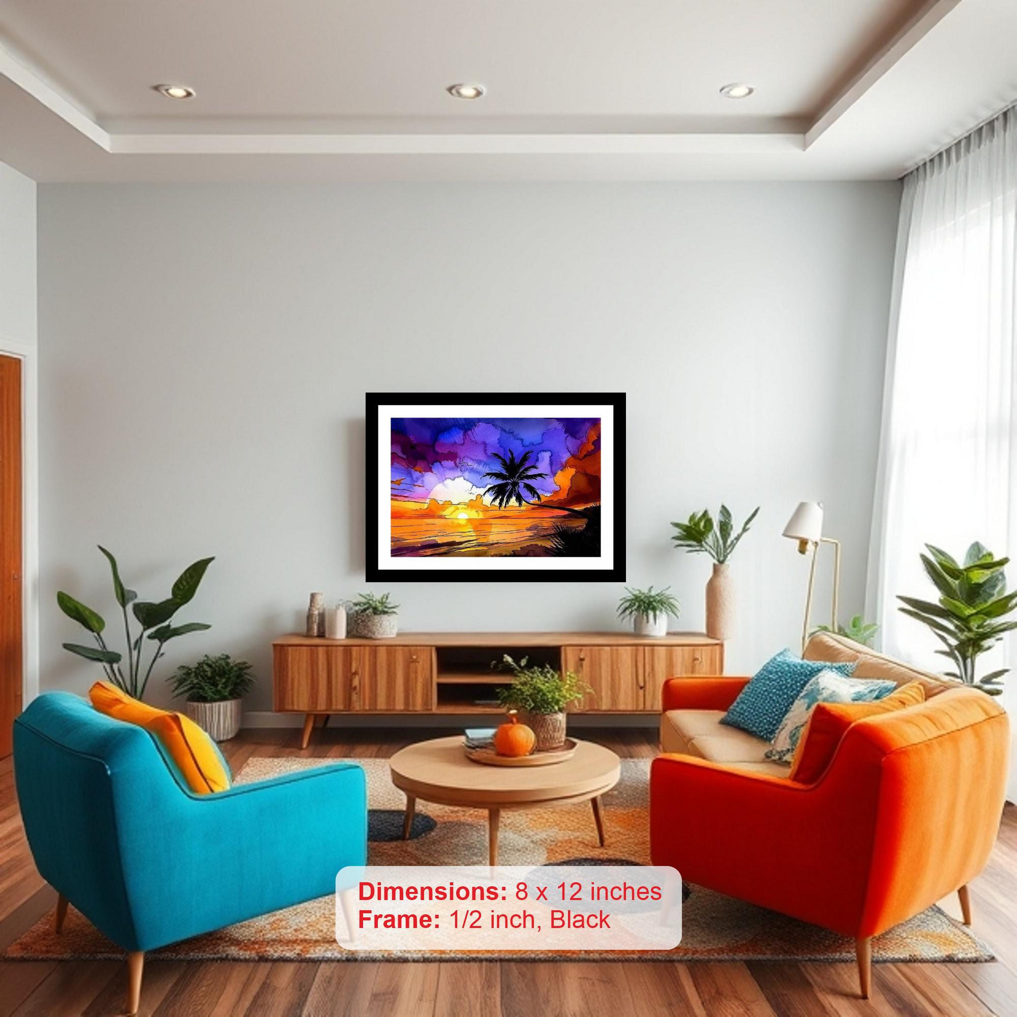 Capture the serene beauty of a tropical sunset with our classic black framed digital reprint. This elegant piece depicts a vibrant sunset painting the sky with fiery hues of orange, red, and gold, silhouetting a lone palm tree on a tranquil beach. The scene evokes a sense of peace and escape, perfect for adding a touch of warmth and sophistication to any room. The high-quality digital reprint ensures crisp details and rich color reproduction, faithfully capturing the essence of the original artwork. The vintage-style black frame complements the artwork beautifully, adding a touch of classic charm and elegance. This framed print is ready to hang and will instantly enhance your living room, bedroom, office, or any space that needs a touch of tranquil beauty. It also makes a thoughtful and stylish gift for art lovers and anyone who appreciates the beauty of nature.