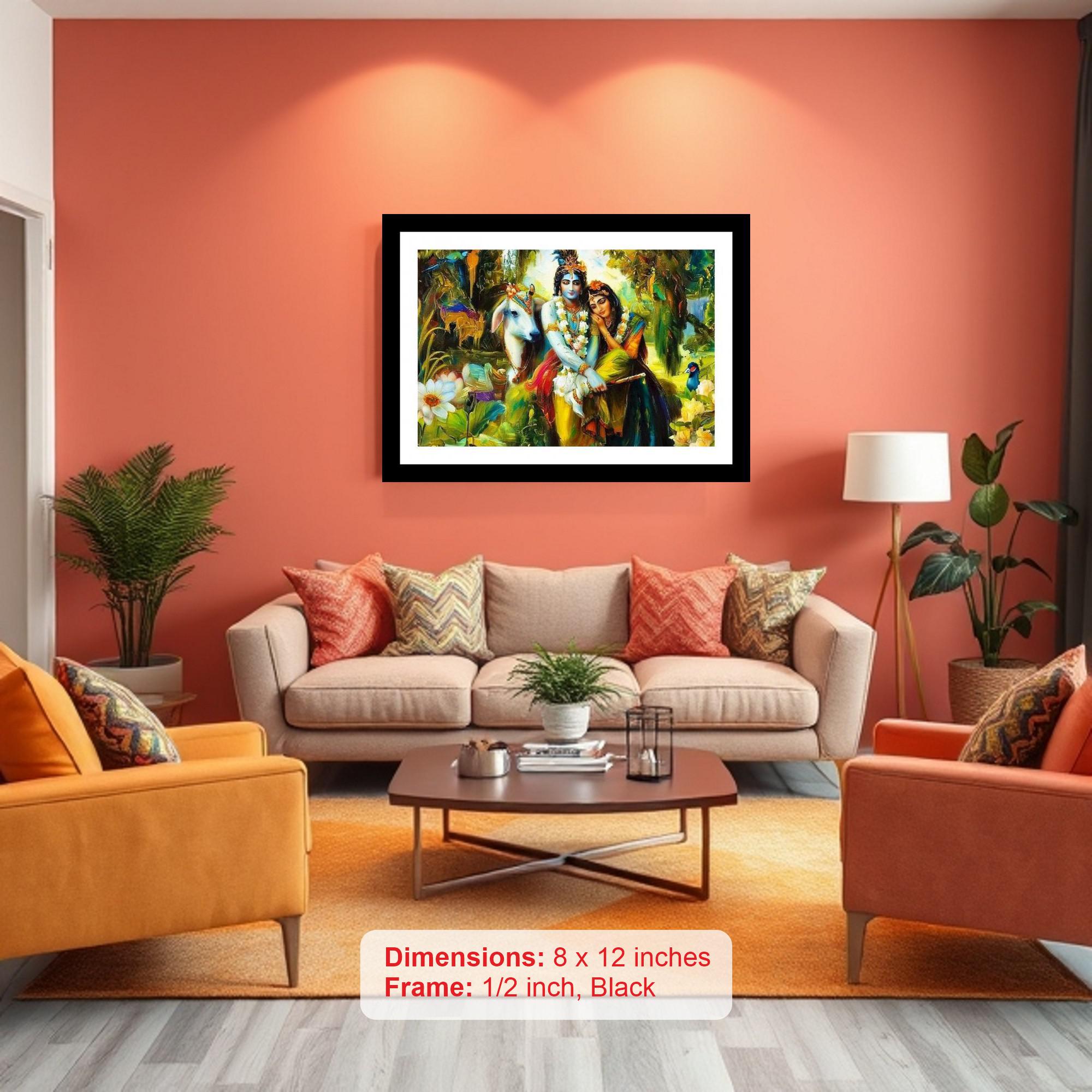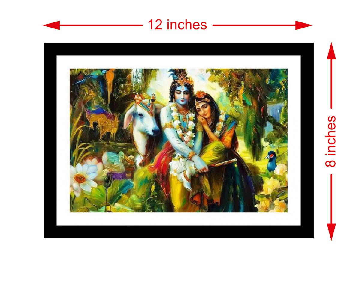 A divine embrace: Krishna and Radha, a vibrant testament to eternal love in a lush, paradisiacal world. The colors are vibrant and true, the print detail is so crisp, it feels like the original. The digital reprint boasts a strikingly beautiful composition, breathing new life into the portrait's timeless grace. Versatile Decor: Ideal for enhancing the aesthetic appeal of living rooms and bedrooms Enhanced Durability: Weather-shield laminated digital print for lasting vibrancy and protection Premium Framing: Constructed with a high-quality, durable fiber frame for long-term stability Precise Dimensions: 30 cm x 20 cm x 1 cm