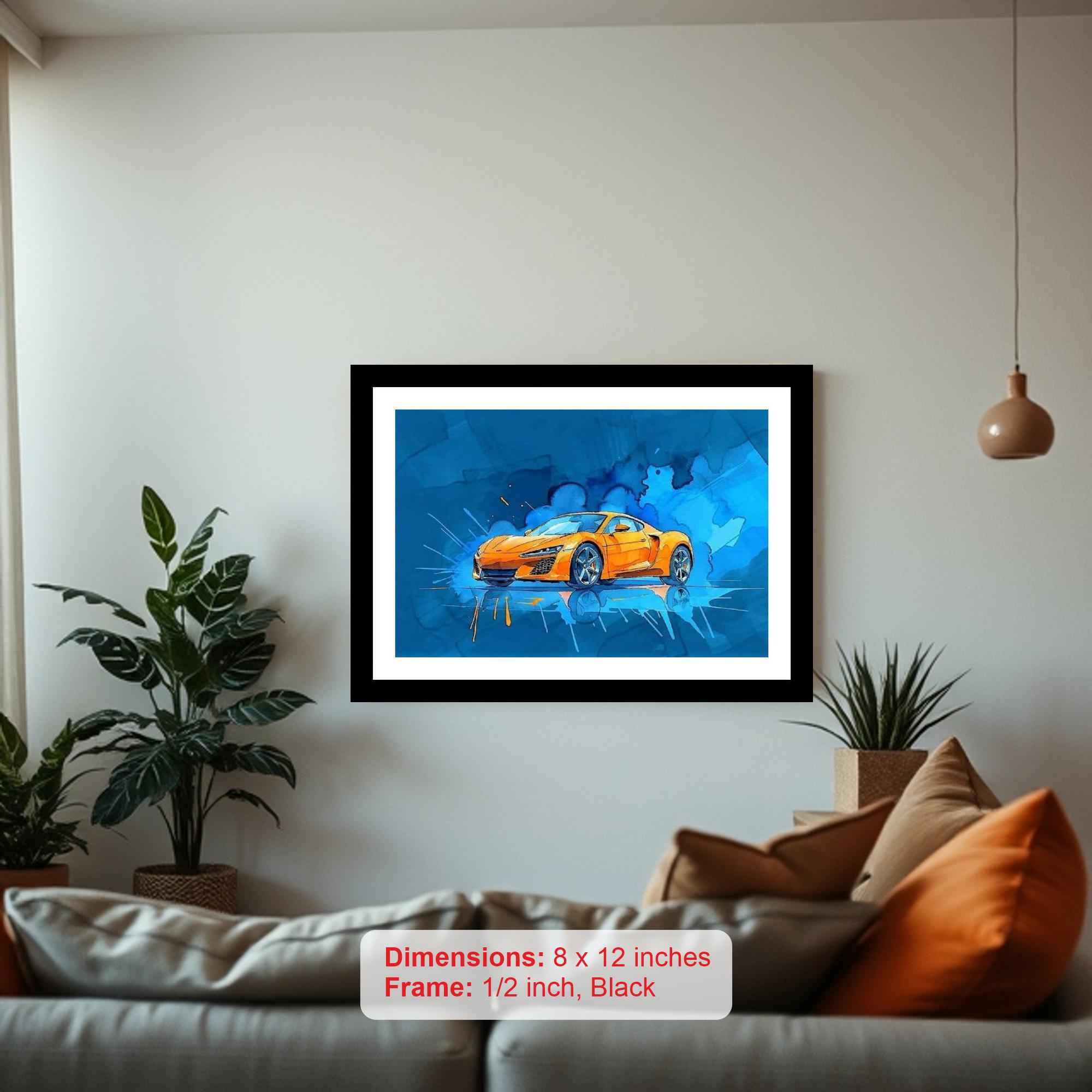 A vibrant orange car bursts from cool blue watercolors, a stunning fusion of energy and fluidity! The colors are vibrant and the print captures every delicate detail of the portrait beautifully. The digital reprint's striking composition truly captures the portrait's original beauty and artistic intention. Versatile Decor: Ideal for enhancing the aesthetic appeal of living rooms and bedrooms Enhanced Durability: Weather-shield laminated digital print for lasting vibrancy and protection Premium Framing: Constructed with a high-quality, durable fiber frame for long-term stability Precise Dimensions: 30 cm x 20 cm x 1 cm