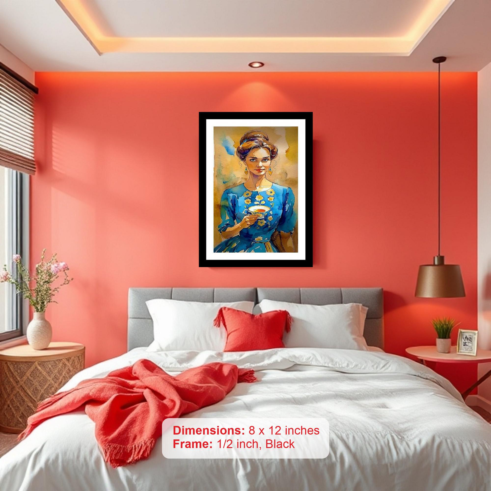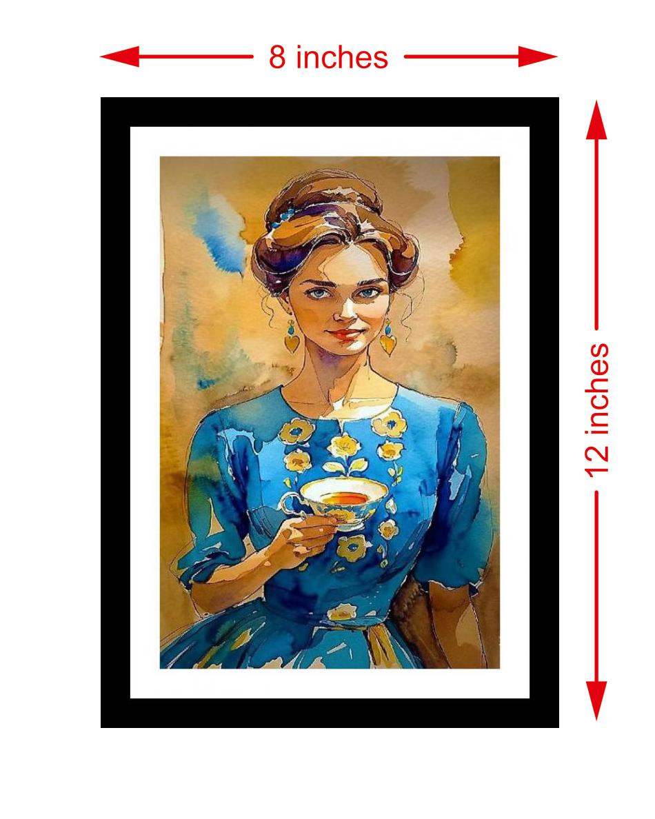 A serene painting beautifully captures a lady in blue, savoring tea amidst floral charm. The reprint's colors burst with life, and the print is so sharp it feels like you could reach out and touch the subject! The digital reprint's composition is striking; it beautifully captures the portrait's original artistic intent. Versatile Decor: Ideal for enhancing the aesthetic appeal of living rooms and bedrooms Enhanced Durability: Weather-shield laminated digital print for lasting vibrancy and protection Premium Framing: Constructed with a high-quality, durable fiber frame for long-term stability Precise Dimensions: 30 cm x 20 cm x 1 cm