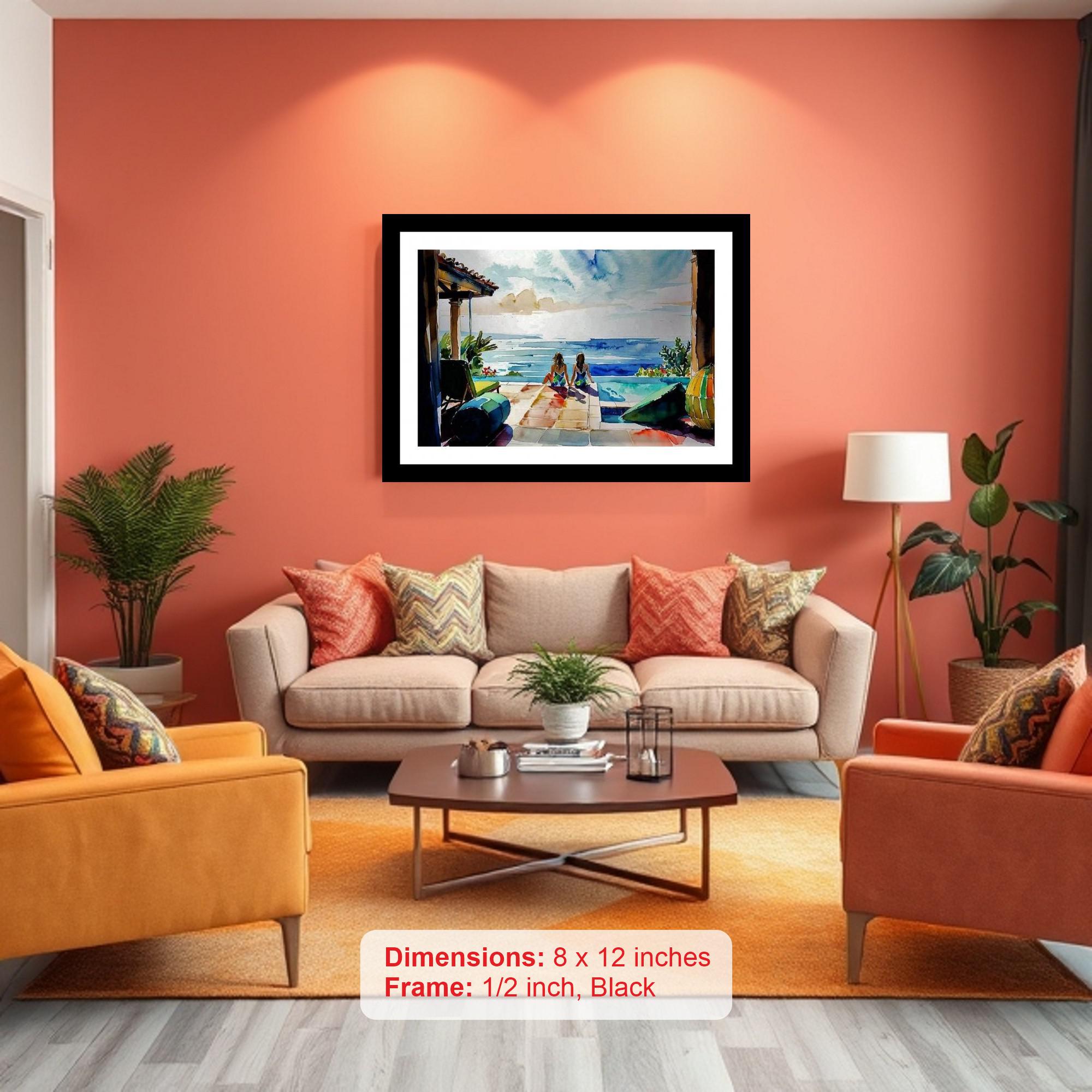 A serene painting captures the tranquility of two women enjoying a breathtaking ocean vista from an infinity pool. The colors are vibrant and the print is crisp, making this reprint a stunning tribute to the original portrait. The portrait's digital reprint boasts a striking composition, breathing new life into a timeless beauty. Versatile Decor: Ideal for enhancing the aesthetic appeal of living rooms and bedrooms Enhanced Durability: Weather-shield laminated digital print for lasting vibrancy and protection Premium Framing: Constructed with a high-quality, durable fiber frame for long-term stability Precise Dimensions: 30 cm x 20 cm x 1 cm