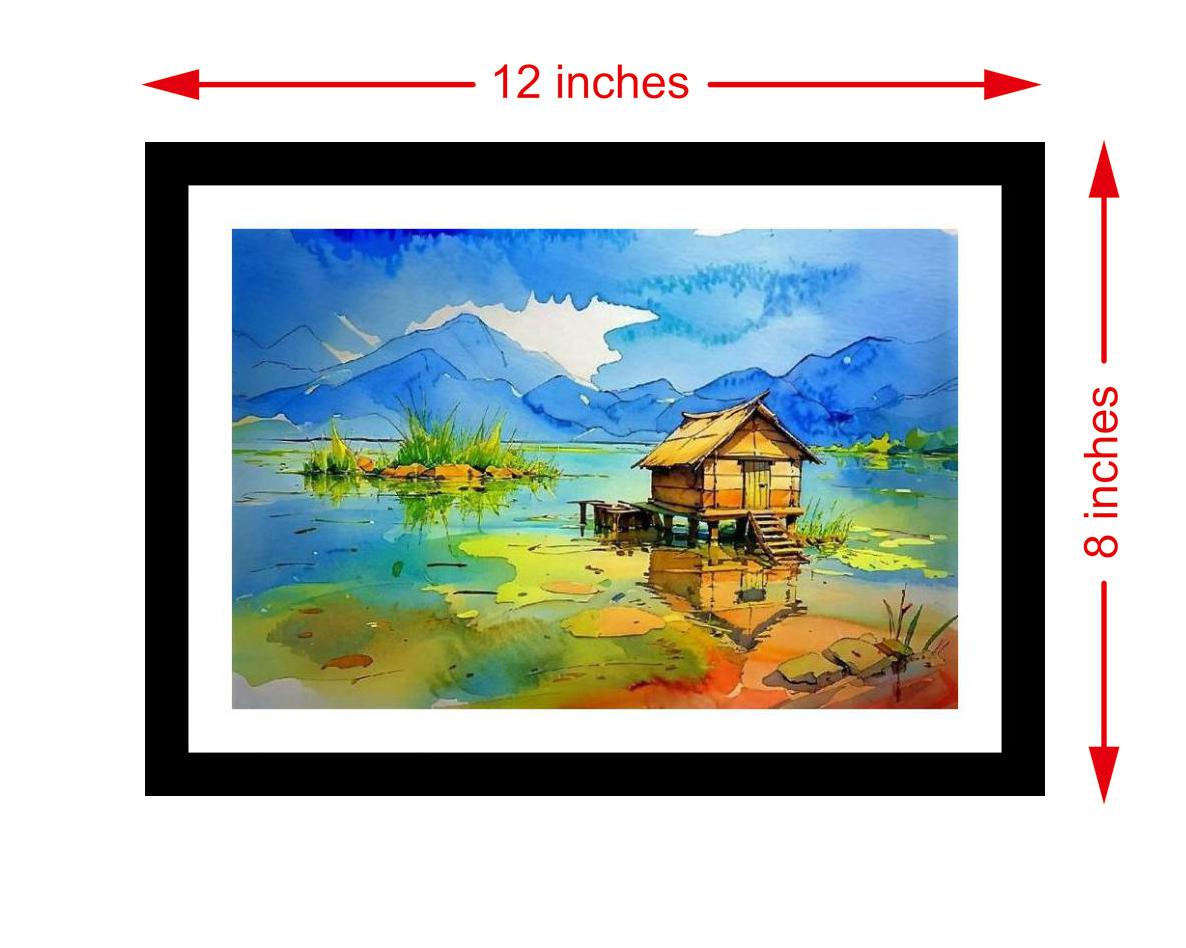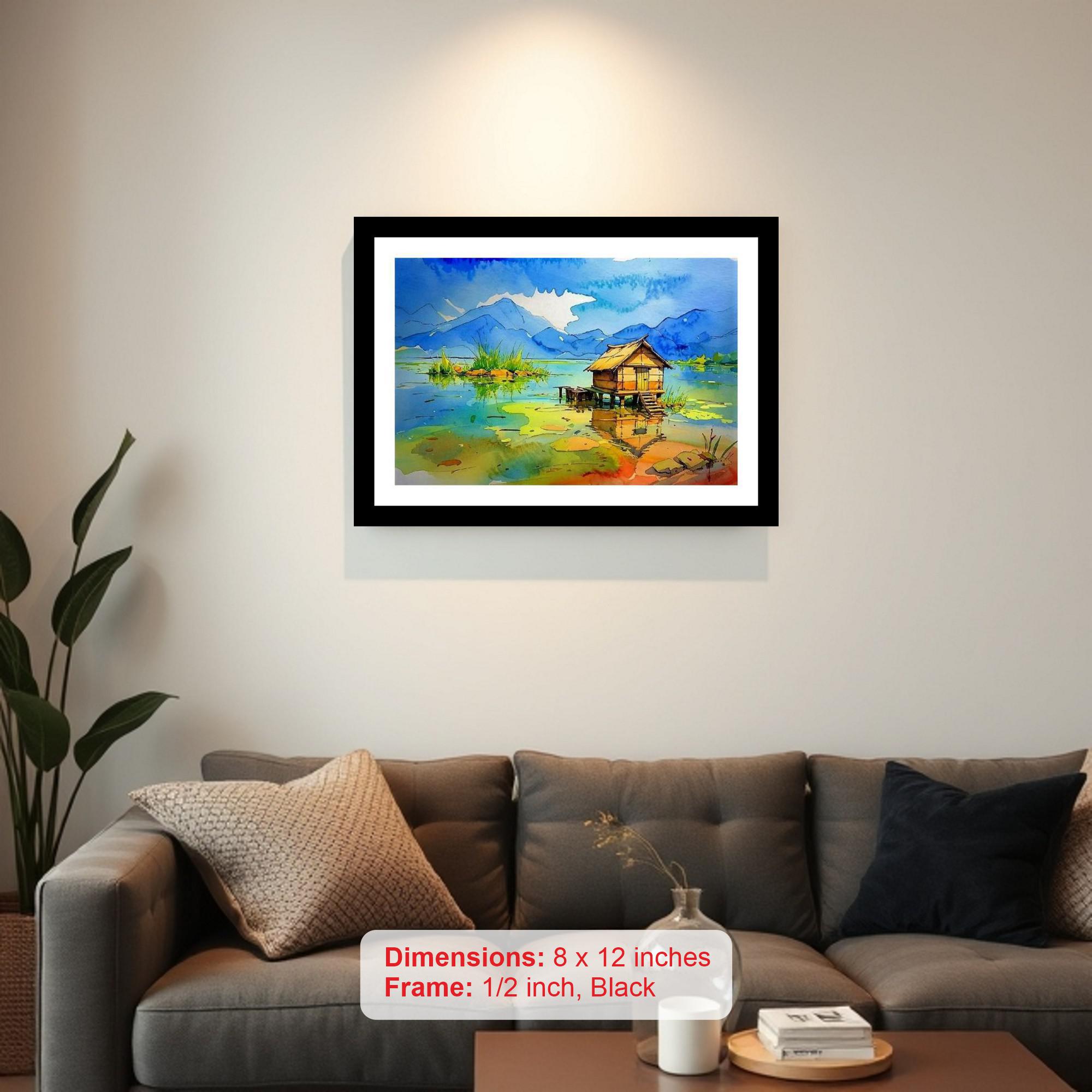 Escape into a world of tranquility with our classic black Framed Digital Reprint, showcasing a serene lakeside hut nestled amidst a vibrant mountain landscape. This elegant piece captures the timeless beauty of nature, blending rustic charm with breathtaking scenery. The artwork features a quaint hut peacefully situated on the edge of a shimmering lake, reflecting the surrounding majestic mountains in its still waters. The vibrant colors of the landscape - lush greens of the trees, earthy browns of the mountains, and the varying blues of the sky and lake - create a captivating visual experience. Encased in a vintage-inspired black frame, this reprint exudes sophistication and adds a touch of classic artistry to any space. The black frame complements the artwork perfectly, enhancing its richness and providing a refined presentation. Perfect for living rooms, bedrooms, offices, or hallways, this piece offers a calming and inspiring atmosphere, inviting viewers to immerse themselves in the tranquility of the scene. Its high-quality digital reprint ensures clarity and detail, preserving the original artwork's beauty for years to come. Bring the serenity of the lakeside and the majesty of the mountains into your home with this exquisite framed art piece.