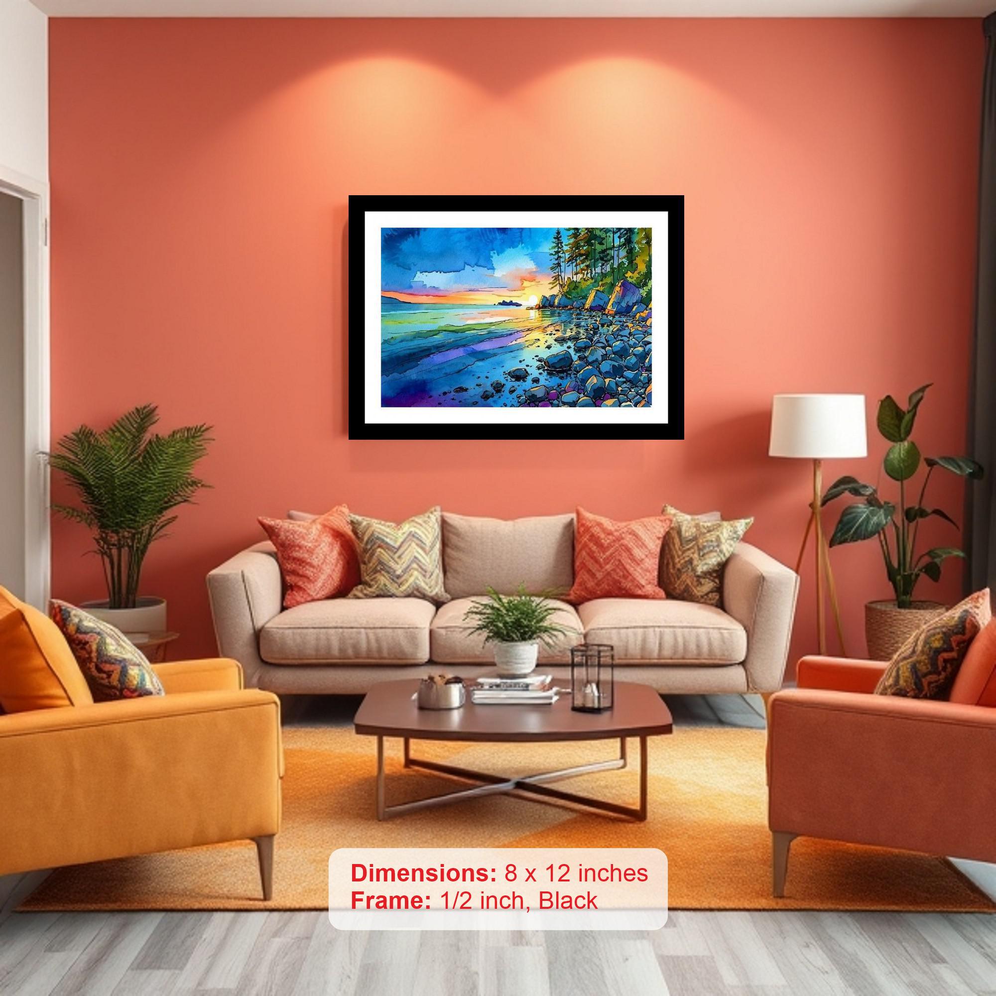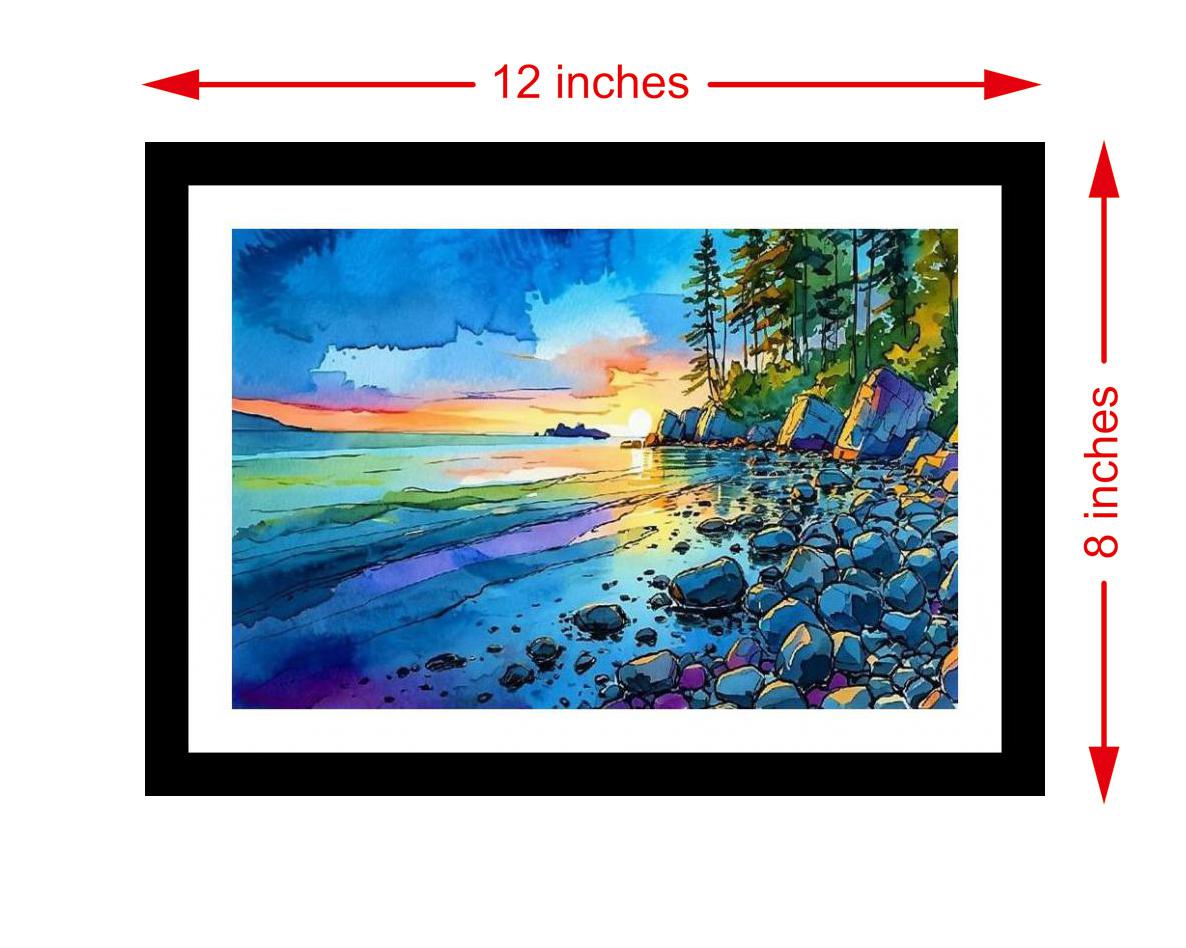 A vibrant sunset transforms a rocky beach into a breathtaking canvas of colorful hues. Colors are vibrant and the print captures every delicate detail of the original portrait. The reprint's sharp detail and balanced light capture the portrait's original beauty flawlessly. A stunning composition! Versatile Decor: Ideal for enhancing the aesthetic appeal of living rooms and bedrooms Enhanced Durability: Weather-shield laminated digital print for lasting vibrancy and protection Premium Framing: Constructed with a high-quality, durable fiber frame for long-term stability Precise Dimensions: 30 cm x 20 cm x 1 cm