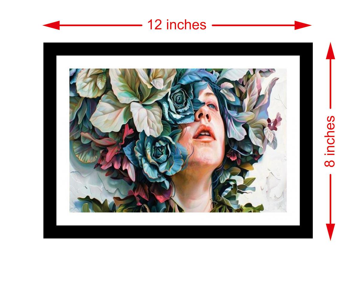 A stunning portrait: a woman blooms amidst hyperrealistic flora, surreal beauty personified. The colors are vibrant and the print captures every delicate detail of the original portrait. The digital reprint boasts a striking composition, faithfully capturing the portrait's original beauty and artistic vision. Versatile Decor: Ideal for enhancing the aesthetic appeal of living rooms and bedrooms Enhanced Durability: Weather-shield laminated digital print for lasting vibrancy and protection Premium Framing: Constructed with a high-quality, durable fiber frame for long-term stability Precise Dimensions: 30 cm x 20 cm x 1 cm