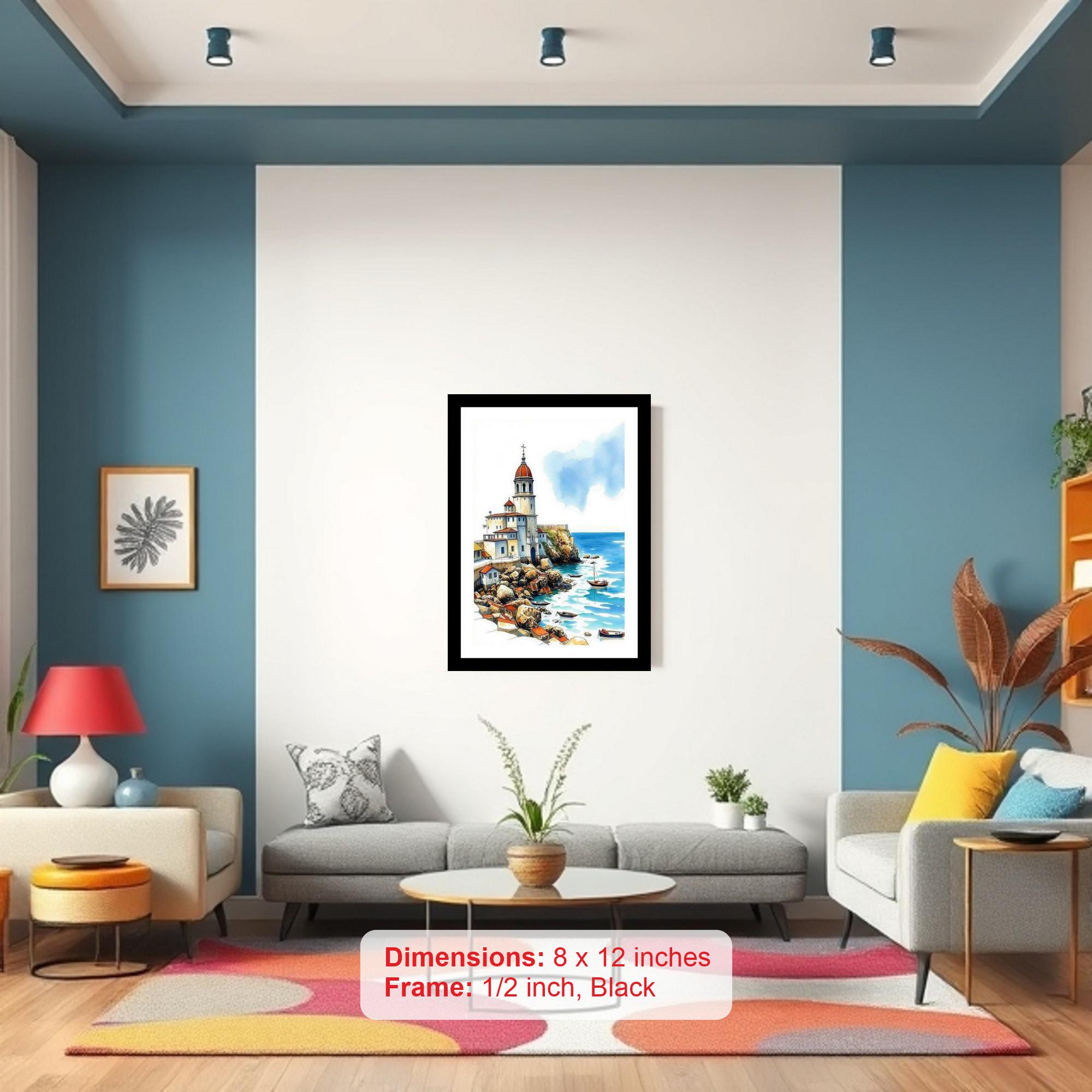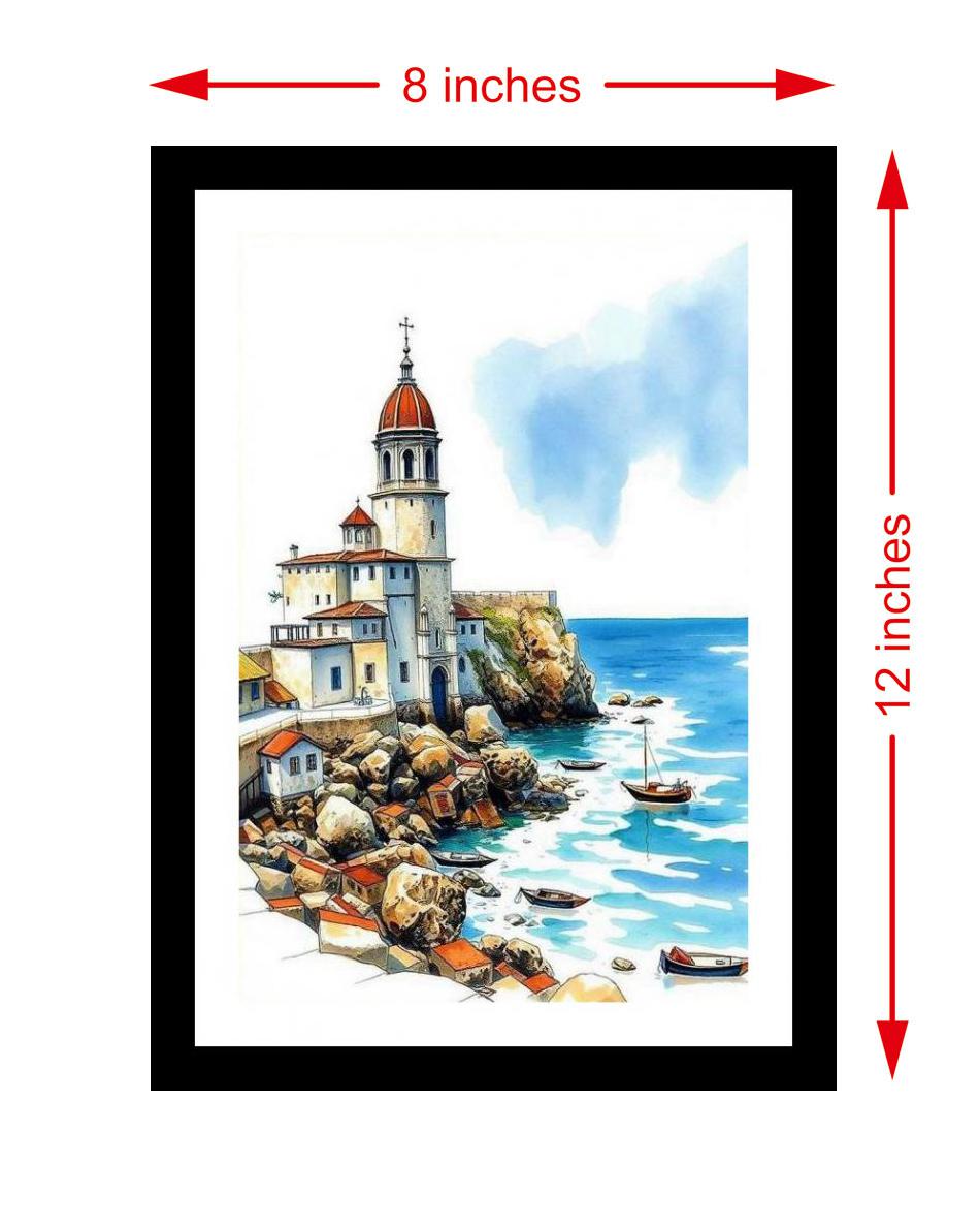 Capture timeless beauty with this exquisite classic black-framed digital reprint. This elegant artwork depicts a picturesque coastal monastery clinging dramatically to a rocky cliffside, with boats gently bobbing in the tranquil waters below. The black frame adds a touch of classic sophistication, enhancing the artwork's charm and making it a stunning focal point for any room. Perfect for adding a touch of serenity and old-world charm to your home decor, this piece evokes a sense of peace and tranquility. It is ideal for living rooms, bedrooms, offices, or any space where you desire a calming and visually appealing element. Bring the serene beauty of the coast into your home with this captivating piece of art.