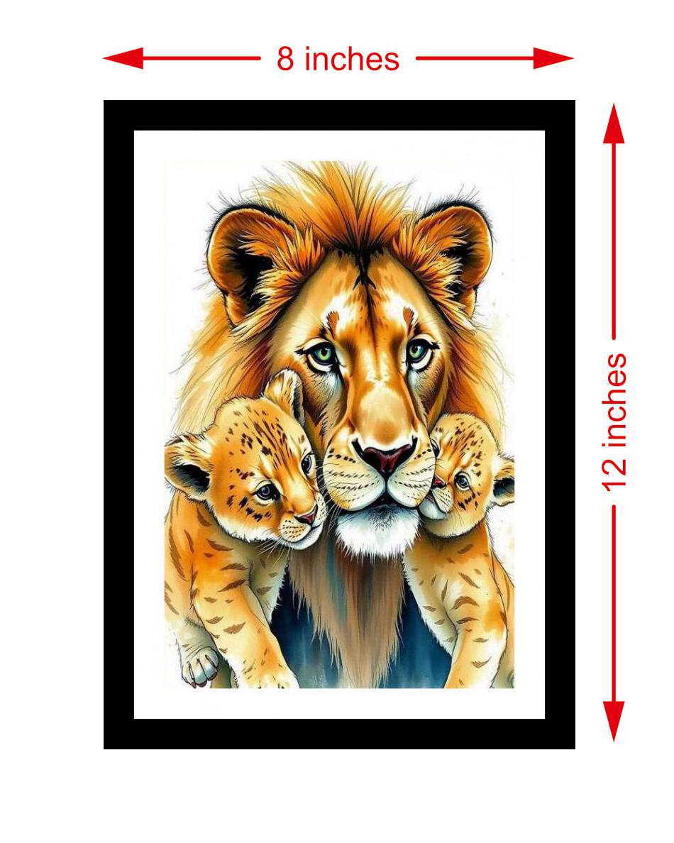 A heartwarming masterpiece: a majestic lion's tender embrace of his cubs captures familial love beautifully. The colors pop, and the print captures every delicate detail of the original portrait beautifully. The portrait's digital reprint boasts a striking composition, breathing new life into the original's beauty. Versatile Decor: Ideal for enhancing the aesthetic appeal of living rooms and bedrooms Enhanced Durability: Weather-shield laminated digital print for lasting vibrancy and protection Premium Framing: Constructed with a high-quality, durable fiber frame for long-term stability Precise Dimensions: 30 cm x 20 cm x 1 cm