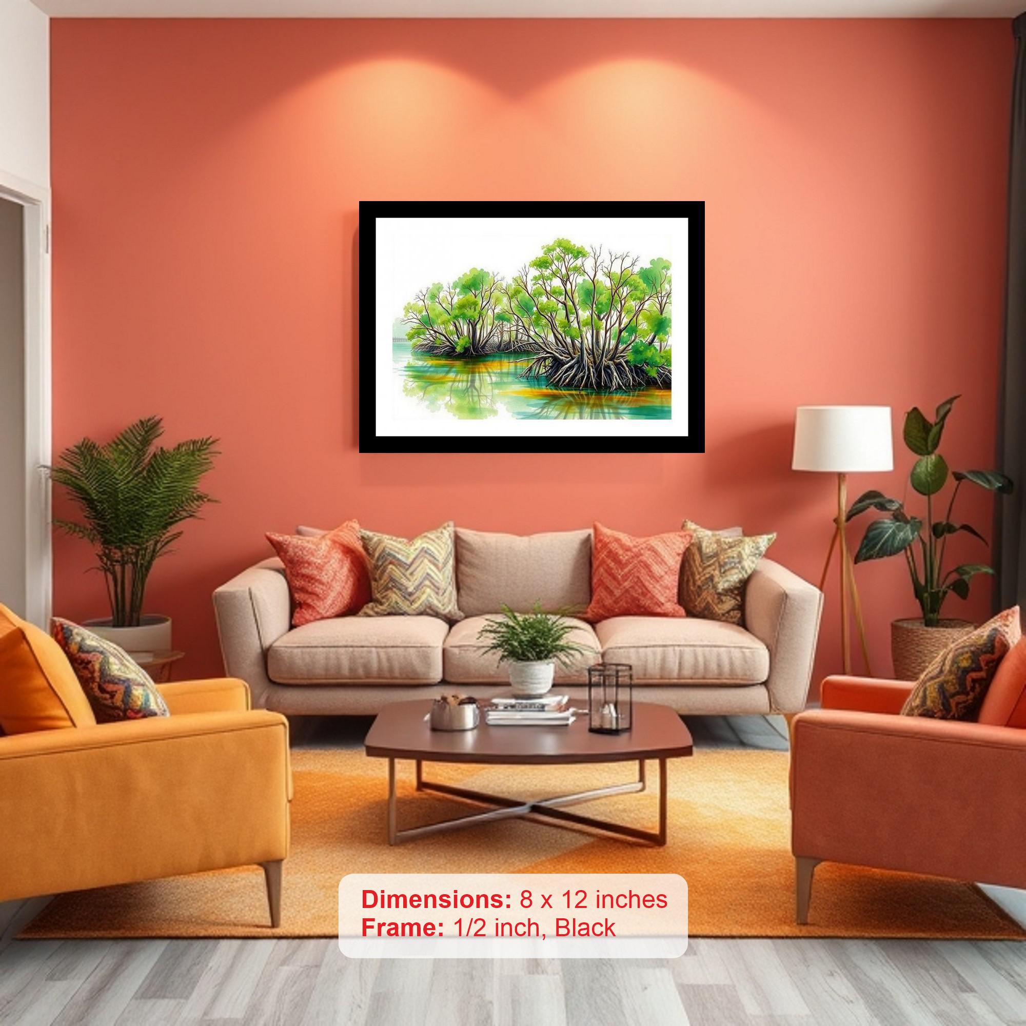 Evoke timeless elegance with this classic black framed digital reprint showcasing a captivating portrait of lush mangrove trees reflected in tranquil waters. This elegant artwork brings a touch of nature's serenity and classic artistry to any space. The intricate details of the mangrove's exposed roots and vibrant foliage are beautifully captured, while the black frame adds a touch of sophistication and warmth. Perfect for living rooms, bedrooms, or offices, this piece is a stunning addition to any art collection, offering a unique blend of vintage charm and natural beauty. Enjoy the beauty of nature indoors with this exquisite wall decor, printed on high-quality material to ensure lasting vibrancy.