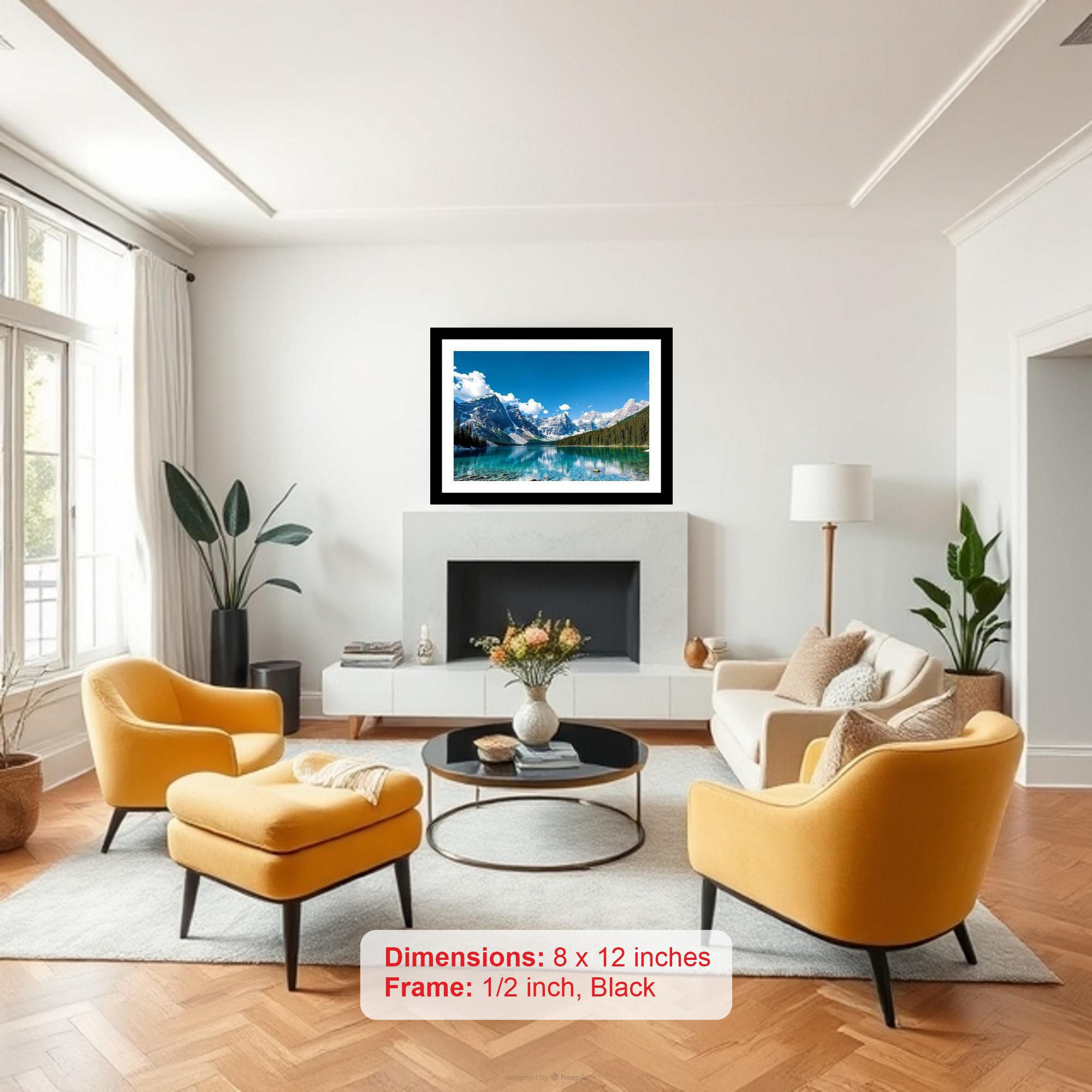 A breathtaking Canadian Rockies vista: turquoise lake, snow-capped peaks, and azure sky create serene beauty. The reprint's vibrant colors and crisp details bring the photograph to life - truly stunning! The reprint's composition is stunning; the digital remaster breathes new life into a timeless photographic artwork. Versatile Decor: Ideal for enhancing the aesthetic appeal of living rooms and bedrooms Enhanced Durability: Weather-shield laminated digital print for lasting vibrancy and protection Premium Framing: Constructed with a high-quality, durable fiber frame for long-term stability Precise Dimensions: 30 cm x 20 cm x 1 cm
