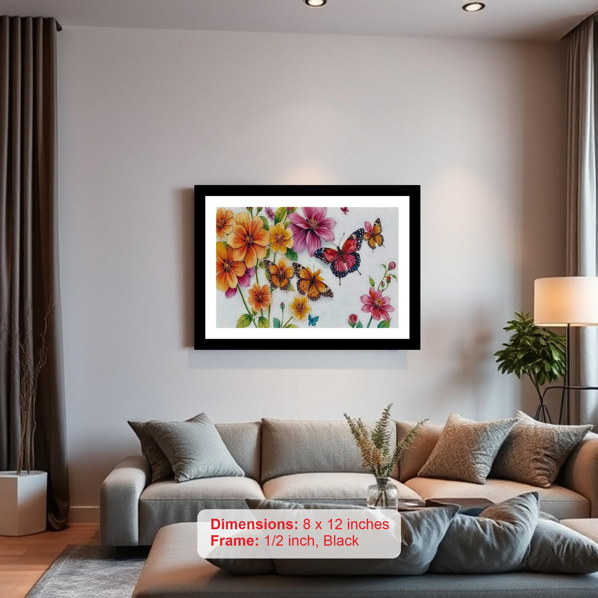 Adorn your walls with timeless elegance! This captivating digital reprint features a vibrant portrait of colorful flowers gracefully hosting delicate butterflies, all encased within a classic black frame. The artwork evokes a sense of tranquility and natural beauty, adding a touch of sophistication to any room. Meticulously reproduced to capture the original artwork's intricate details and rich hues, this piece offers exceptional clarity and color fidelity. The classic black frame provides a refined contrast, enhancing the artwork's visual impact and seamlessly integrating with diverse interior styles, from modern minimalist to traditional decor. Ideal for living rooms, bedrooms, hallways, or offices, this framed print serves as a stunning focal point or a complementary accent piece. Ready to hang upon arrival, this beautiful artwork offers effortless installation and instant enhancement to your home's ambiance. Experience the enduring allure of floral artistry and the delicate dance of butterflies with this exquisite framed print, a perfect addition to any art lover's collection.