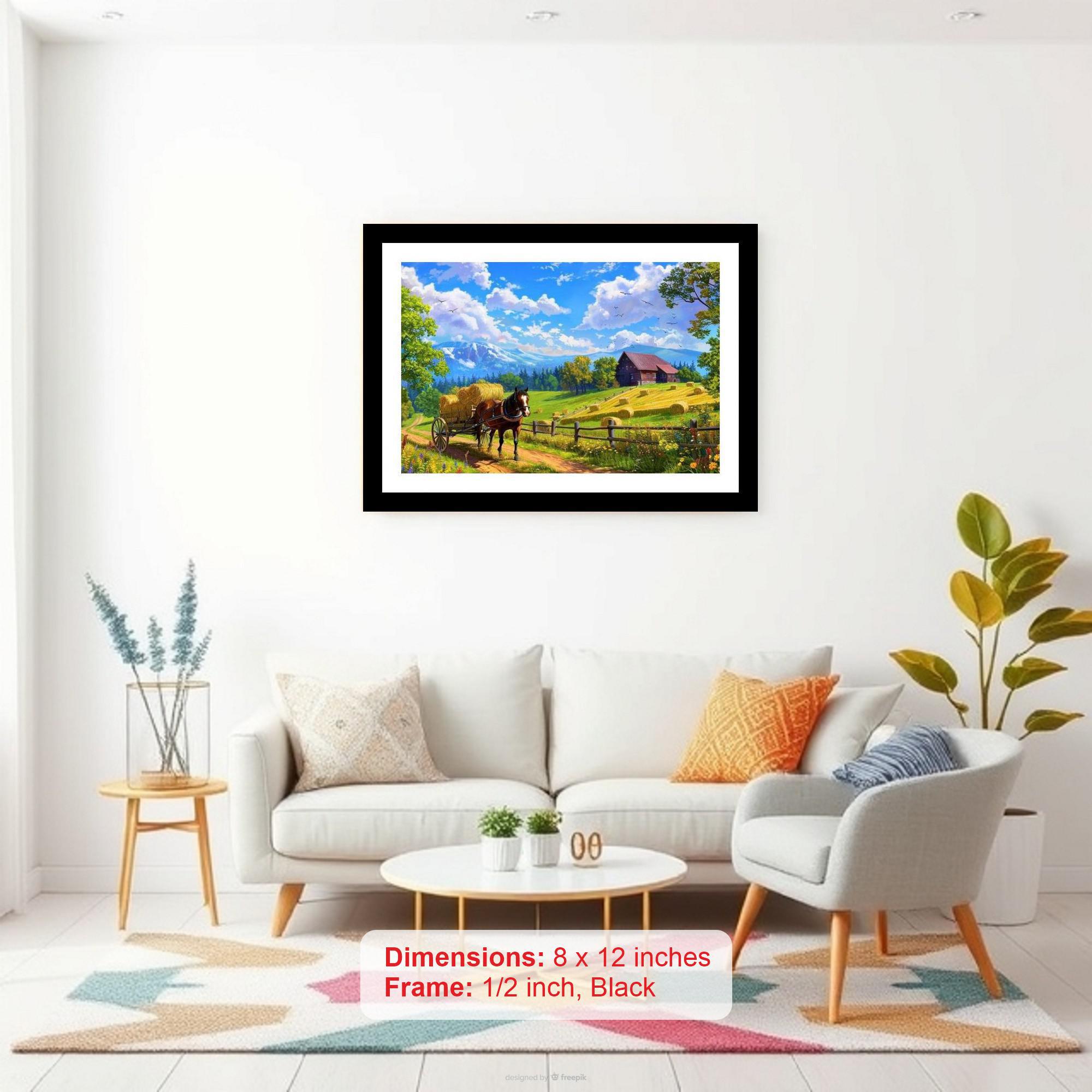 Capture the timeless beauty of the countryside with this elegant, vintage-style digital reprint. The black frame enhances the artwork, showcasing a charming scene of a horse-drawn cart laden with hay making its way along a country road. In the background, a picturesque farm nestles comfortably at the foot of majestic mountains, creating a serene and idyllic atmosphere. This piece adds a touch of rustic sophistication to any room, bringing the warmth and tranquility of rural life into your home or office. Perfect for lovers of classic art, equestrian themes, or anyone seeking to add a touch of vintage charm to their decor.