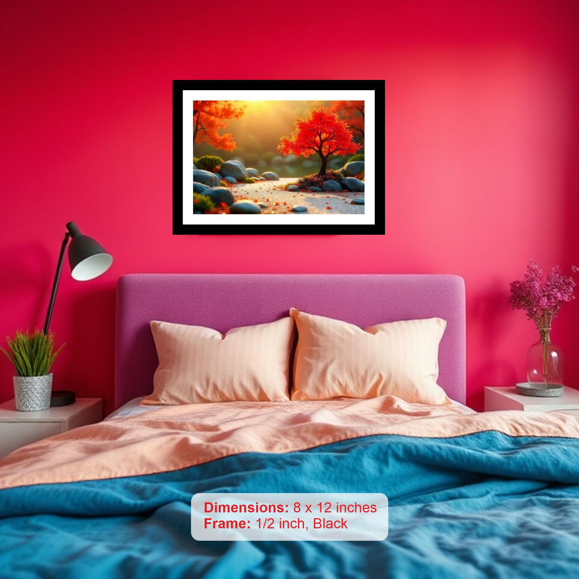 Bring the tranquility of autumn indoors with this elegant digital reprint of a serene landscape. Encased in a vintage-style black frame, the artwork captures a vibrant maple tree ablaze with fall colors, standing amidst smooth stones bathed in the warm glow of golden sunlight. This piece evokes a sense of peace and nostalgia, perfect for adding a touch of classic beauty to any living room, bedroom, or office. Its timeless appeal and warm hues create a cozy and inviting atmosphere, making it a cherished addition to your home decor or a thoughtful gift for art lovers. Enjoy the enduring beauty of autumn with this exquisite framed print.
