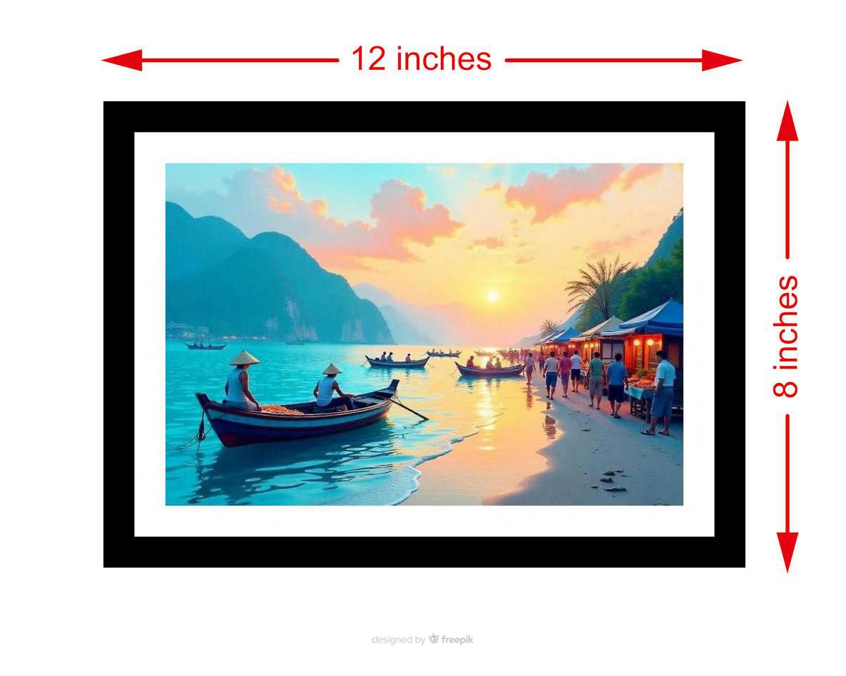 Sunset serenity: boats glide on turquoise waters as people enjoy a vibrant beach market stroll. Pure bliss! The reprint's colors pop & the detail is stunning; feels like I'm seeing the original photograph anew! The digital reprint boasts a strikingly composed image, capturing the original photograph's beauty with remarkable clarity. Versatile Decor: Ideal for enhancing the aesthetic appeal of living rooms and bedrooms Enhanced Durability: Weather-shield laminated digital print for lasting vibrancy and protection Premium Framing: Constructed with a high-quality, durable fiber frame for long-term stability Precise Dimensions: 30 cm x 20 cm x 1 cm