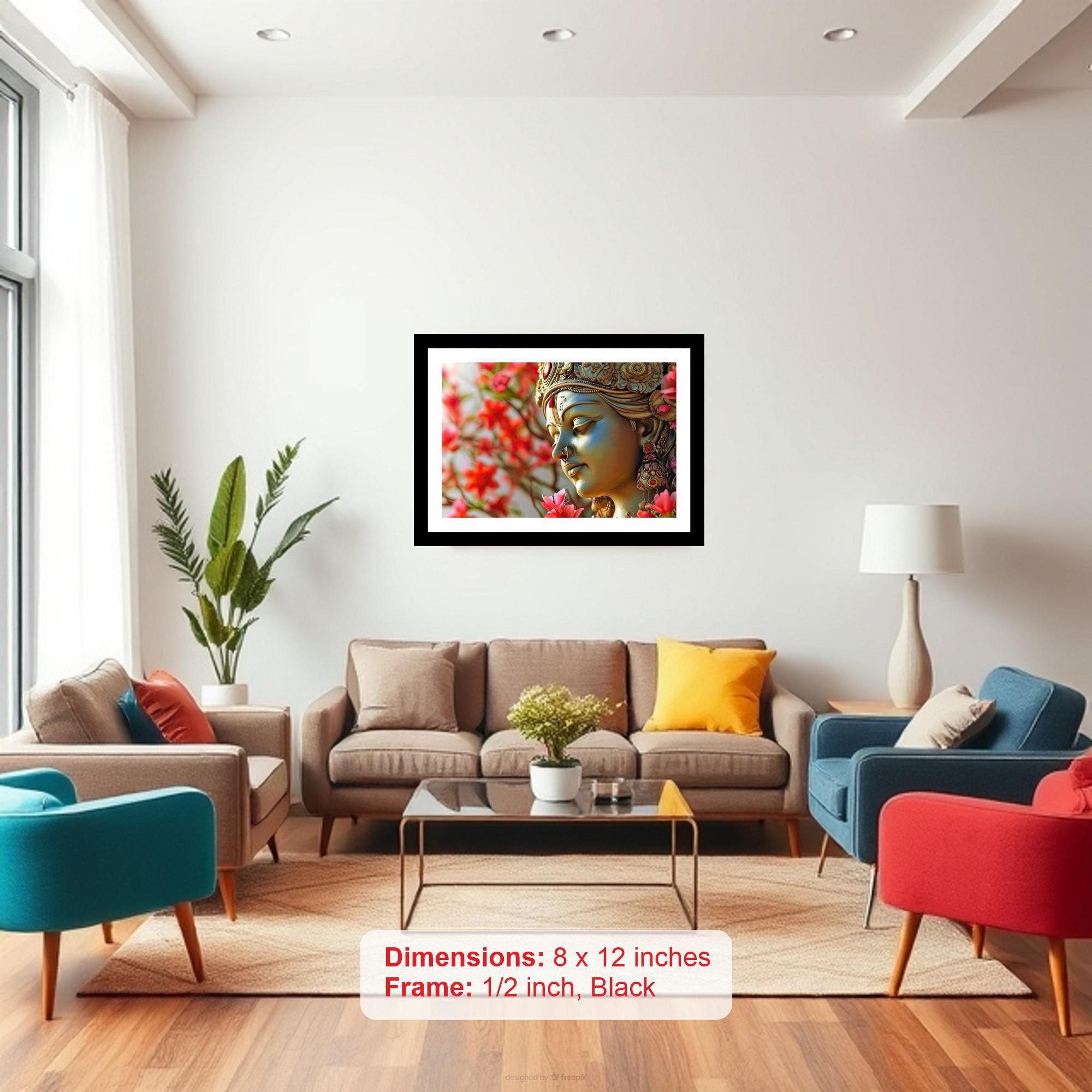 Capture timeless serenity with this vintage-inspired art piece. A digital reprint of a serene deity, richly adorned in gold hues, is elegantly framed in a golden finish. The artwork features a profusion of vibrant blossoms creating a tranquil and captivating visual. Perfect for adding a touch of grace and sophistication to any room. This elegant reprint offers a unique blend of classic artistry and modern technology, ideal for those seeking peaceful and aesthetically pleasing decor.