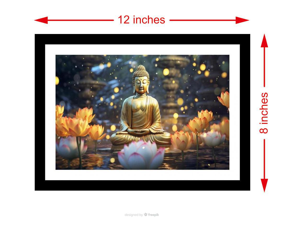 Golden Buddha amidst glowing lotuses: A serene and beautiful vision of peace. The colors are vibrant, the print is sharp, and the details are breathtaking. The reprint's striking composition elevates the photograph to new heights. A truly stunning digital rendition. Versatile Decor: Ideal for enhancing the aesthetic appeal of living rooms and bedrooms Enhanced Durability: Weather-shield laminated digital print for lasting vibrancy and protection Premium Framing: Constructed with a high-quality, durable fiber frame for long-term stability Precise Dimensions: 30 cm x 20 cm x 1 cm