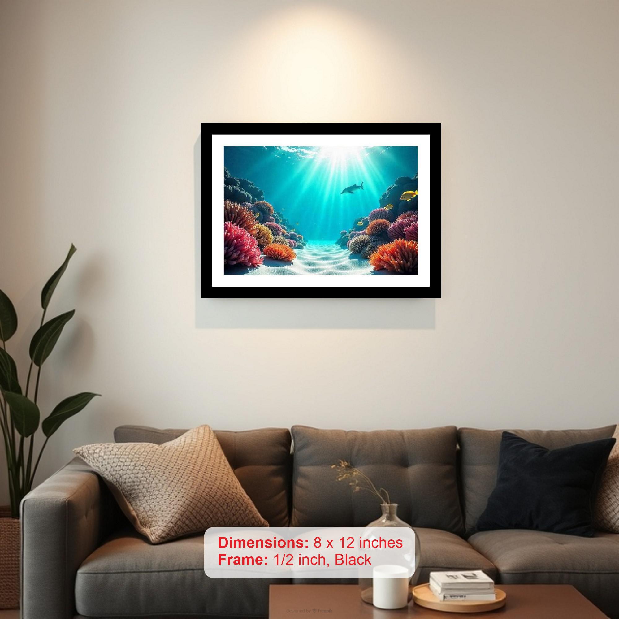 Add a touch of timeless elegance to your home with this vintage-inspired art print. Our stunning digital reprint captures a breathtaking underwater scene: sunbeams pierce through the crystal-clear ocean, illuminating a vibrant coral reef bursting with life. Schools of colorful fish dart amidst the coral formations, while a graceful dolphin adds a touch of majesty to the scene. The image is meticulously reproduced to retain the original photograph's charm and character, presented in a beautiful black frame that complements the artwork perfectly. This elegant piece adds a sophisticated and tranquil ambiance to any living room, bedroom, or office. Bring the beauty of the ocean into your space with this timeless treasure!