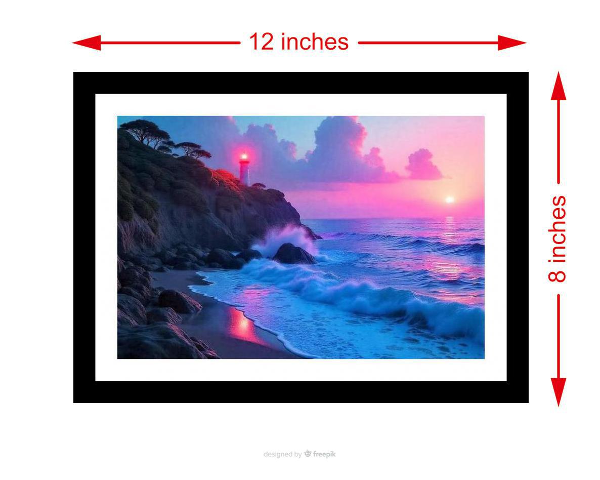 A stunning photo of a lone lighthouse illuminated by a fiery sunset and crashing waves. Colors pop, print is sharp, a true visual feast for the eyes. The digital reprint boasts a striking composition, revitalizing the photo's original beauty with crisp clarity. Versatile Decor: Ideal for enhancing the aesthetic appeal of living rooms and bedrooms Enhanced Durability: Weather-shield laminated digital print for lasting vibrancy and protection Premium Framing: Constructed with a high-quality, durable fiber frame for long-term stability Precise Dimensions: 30 cm x 20 cm x 1 cm