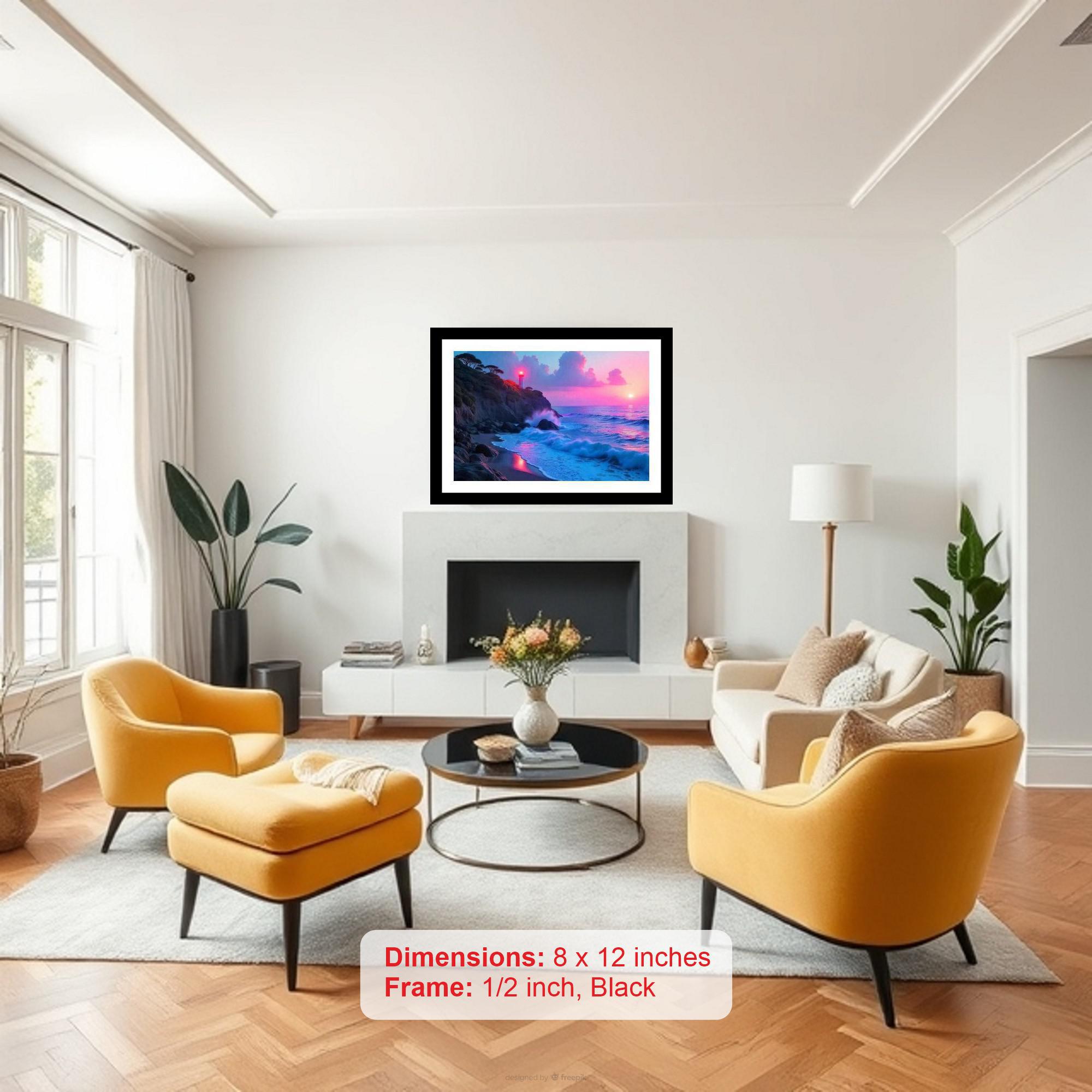 Capture the timeless beauty of the coast with this vintage-inspired digital reprint. Featuring a lone lighthouse bathed in the warm glow of a vibrant sunset, the image evokes a sense of serenity and nostalgia. The crashing waves below add a dynamic element to the tranquil scene. Encased in an elegant black frame, this piece adds a touch of sophistication to any room. Perfect for coastal decor or as a thoughtful gift, this artwork brings the magic of the sea into your home. This high-quality reprint ensures lasting vibrancy and detail, allowing you to enjoy this classic scene for years to come.