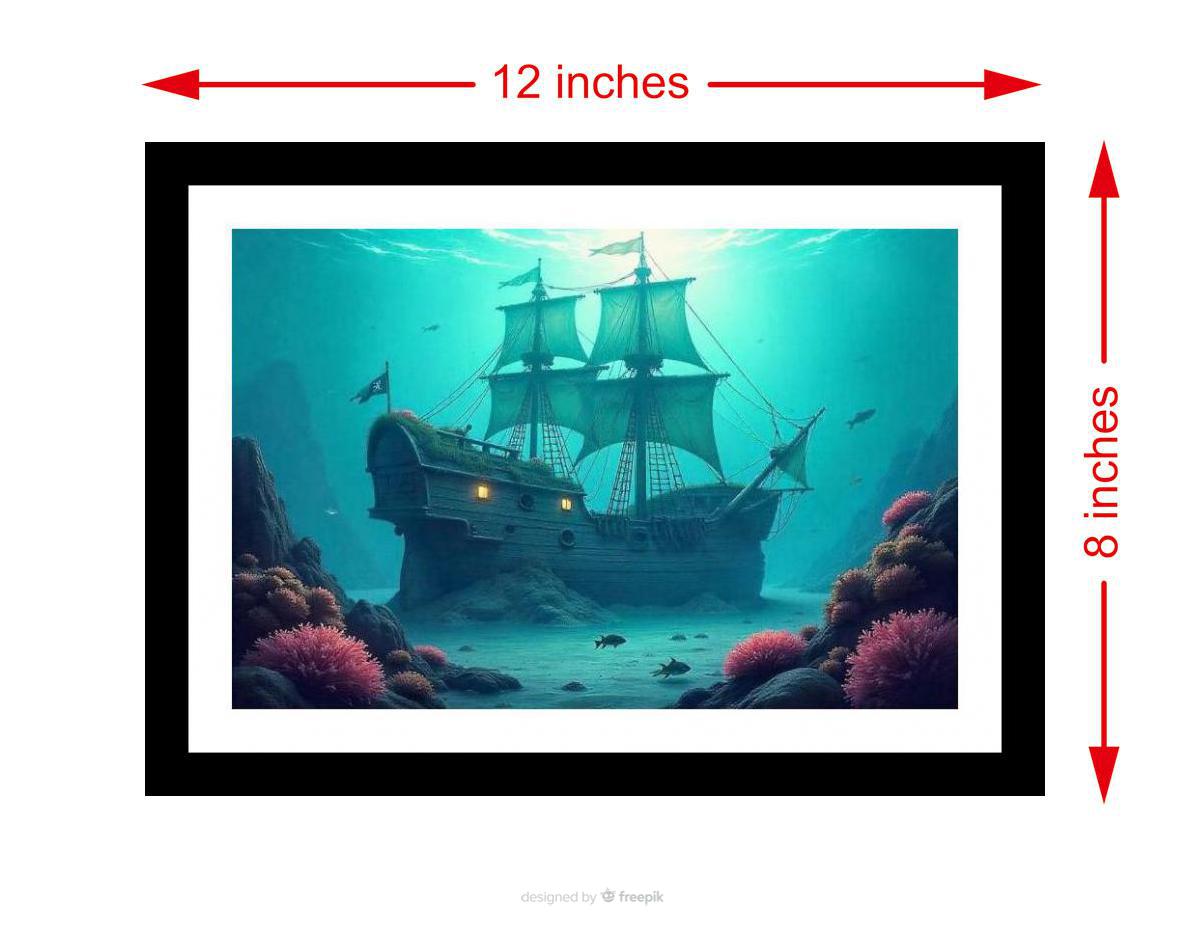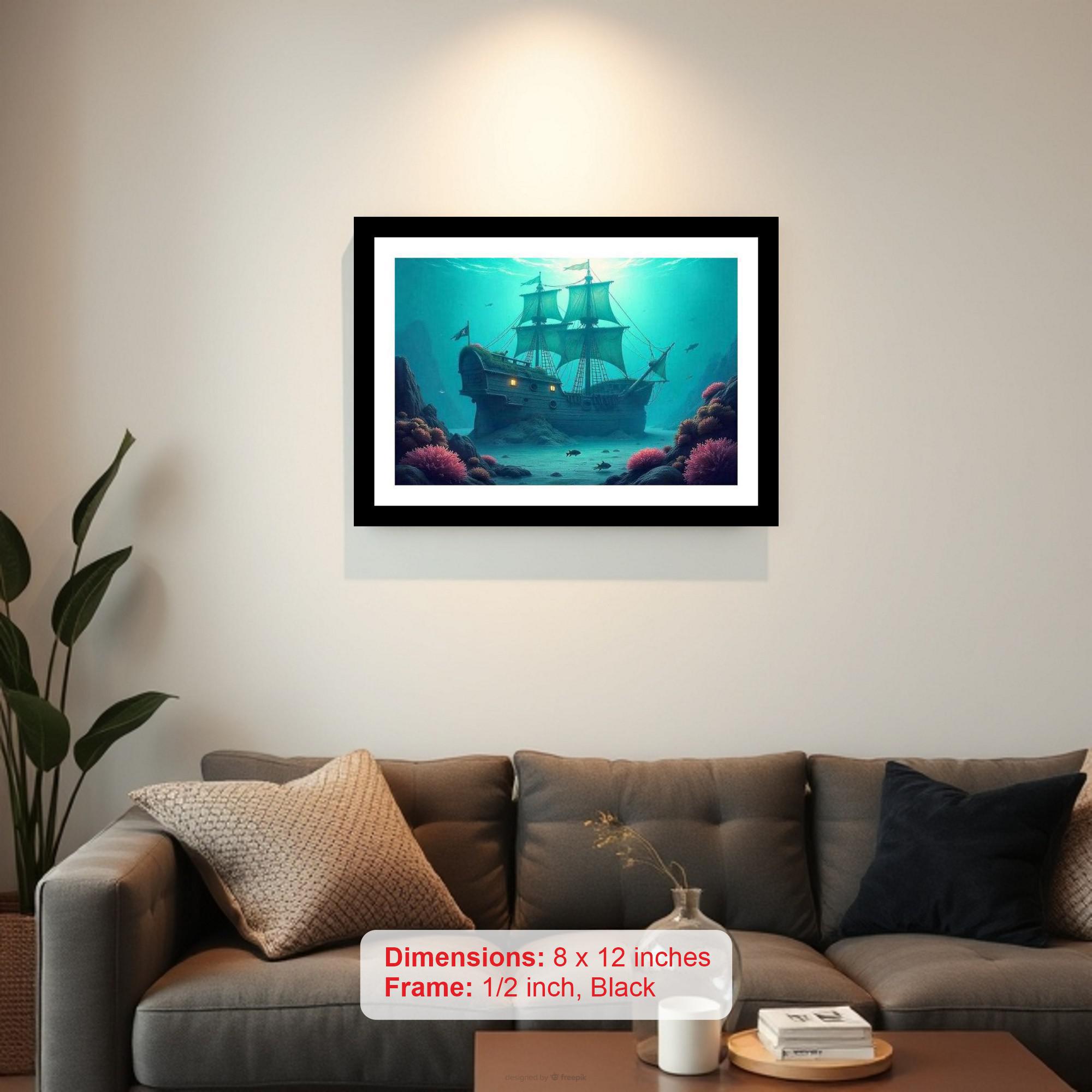 Dive into nautical nostalgia with this exquisite digital reprint of a captivating underwater scene. Encased in a vintage-inspired black frame, this elegant artwork transports you to the depths of the ocean, where a sunken pirate ship becomes a vibrant reef teeming with life. The photograph showcases the ghostly silhouette of the ship, now adorned with colorful coral formations and surrounded by schools of fish, creating a mesmerizing tableau of history and marine beauty. This piece adds a touch of timeless charm and adventurous spirit to any living space, office, or nautical-themed collection. Perfect for history buffs, ocean enthusiasts, or anyone seeking a unique and sophisticated wall decor.