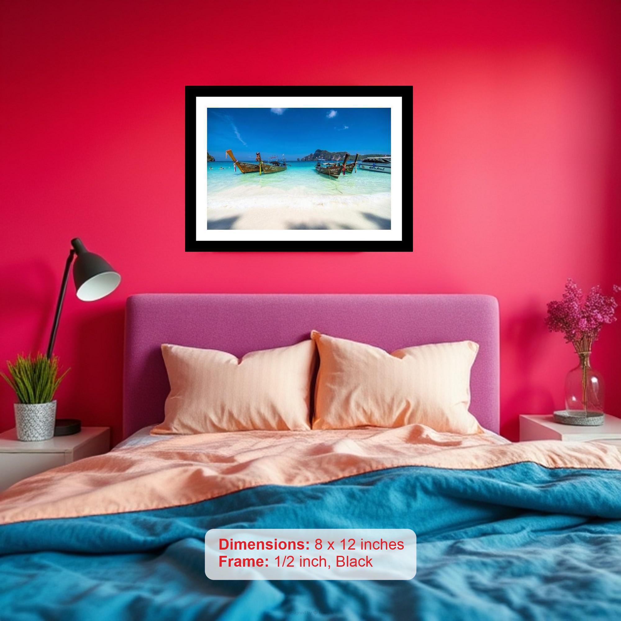 A serene paradise captured: turquoise waters, gently rocking longtail boats, pure tropical bliss. The reprint bursts with vibrant color and crisp detail, truly capturing the photograph's original beauty. The reprint's composition is stunning; the digital clarity truly elevates this already beautiful photograph. Versatile Decor: Ideal for enhancing the aesthetic appeal of living rooms and bedrooms Enhanced Durability: Weather-shield laminated digital print for lasting vibrancy and protection Premium Framing: Constructed with a high-quality, durable fiber frame for long-term stability Precise Dimensions: 30 cm x 20 cm x 1 cm