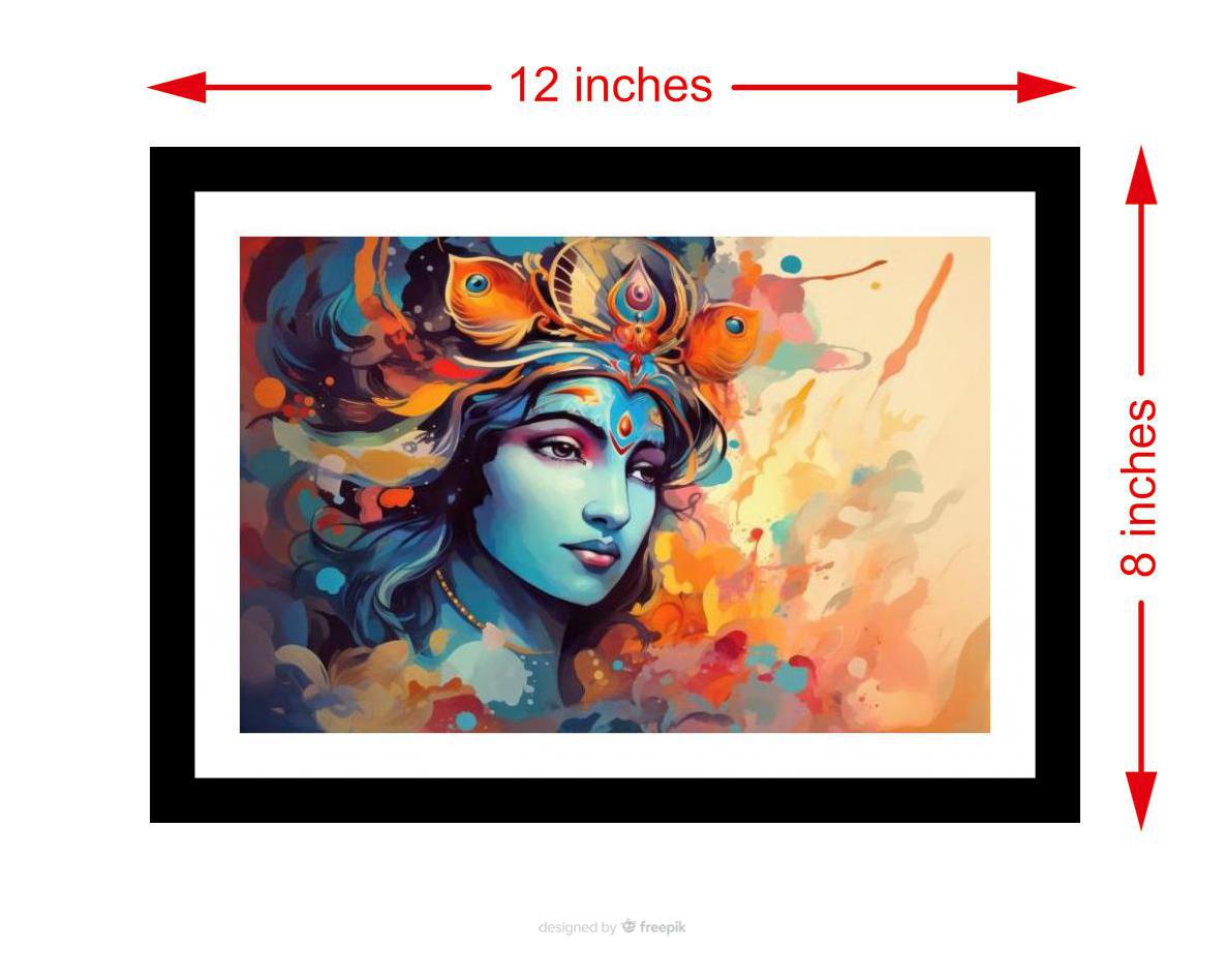 A vibrant, abstract Krishna portrait bursts with peacock hues and radiant colors, a truly divine spectacle! The digital reprint captures the portrait's beauty perfectly; the colors are vibrant, and the print quality is superb. The reprint's composition brilliantly captures the portrait's essence, making it a truly stunning digital homage. Versatile Decor: Ideal for enhancing the aesthetic appeal of living rooms and bedrooms Enhanced Durability: Weather-shield laminated digital print for lasting vibrancy and protection Premium Framing: Constructed with a high-quality, durable fiber frame for long-term stability Precise Dimensions: 30 cm x 20 cm x 1 cm