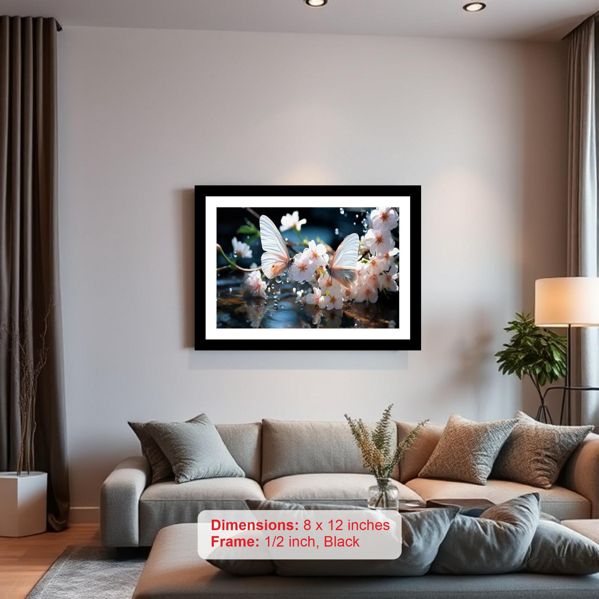 A serene image of butterflies on cherry blossoms mirrored in water, capturing nature's delicate beauty. Colors pop and the print is so sharp, it feels like looking through a window. The reprint's striking composition breathes new life into a beautiful photograph, showcasing its artistry. Versatile Decor: Ideal for enhancing the aesthetic appeal of living rooms and bedrooms Enhanced Durability: Weather-shield laminated digital print for lasting vibrancy and protection Premium Framing: Constructed with a high-quality, durable fiber frame for long-term stability Precise Dimensions: 30 cm x 20 cm x 1 cm