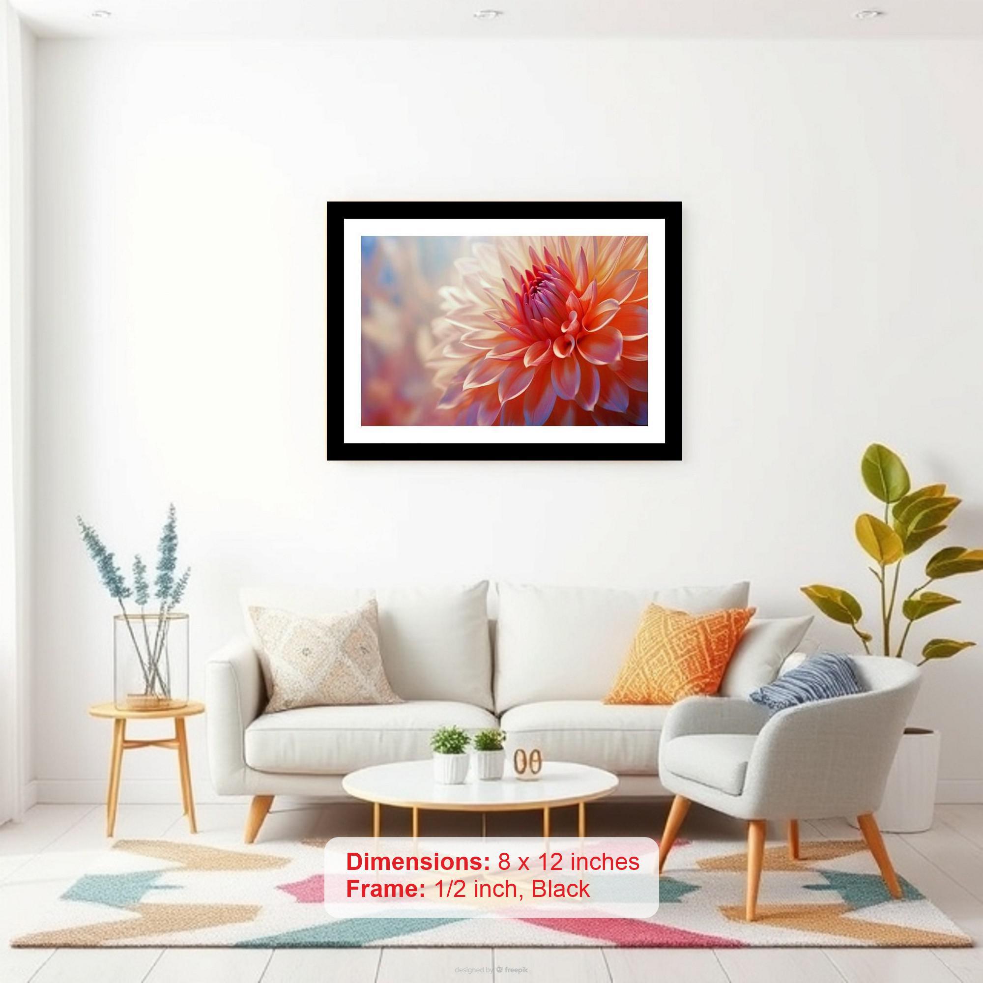Soft sunlight kisses a peach dahlia, its delicate petals unfurling in a stunning, serene bloom. The colors pop, and the print is so sharp - like looking through a window. The digital reprint boasts a stunning composition, breathing new life into a classic photograph. Versatile Decor: Ideal for enhancing the aesthetic appeal of living rooms and bedrooms Enhanced Durability: Weather-shield laminated digital print for lasting vibrancy and protection Premium Framing: Constructed with a high-quality, durable fiber frame for long-term stability Precise Dimensions: 30 cm x 20 cm x 1 cm