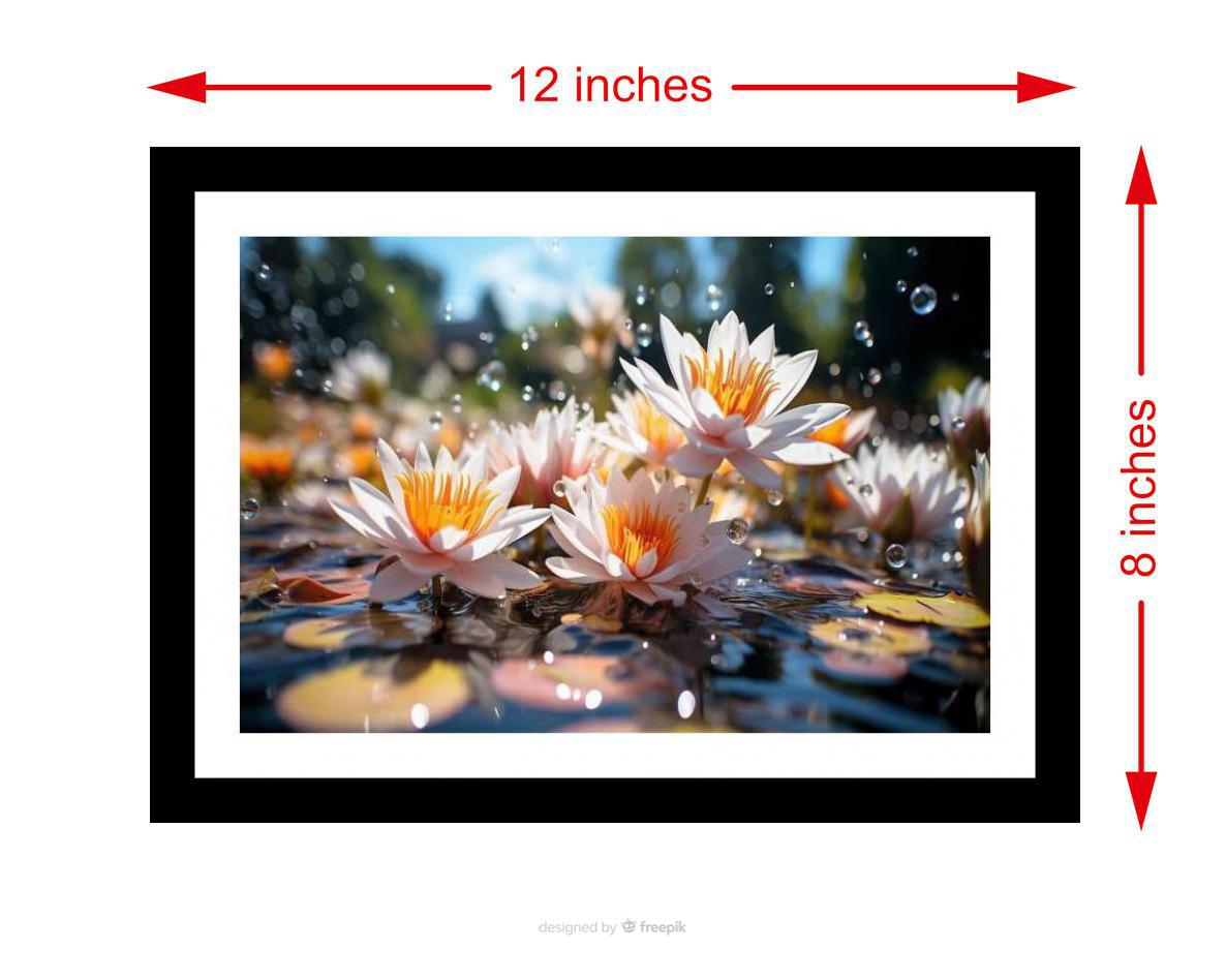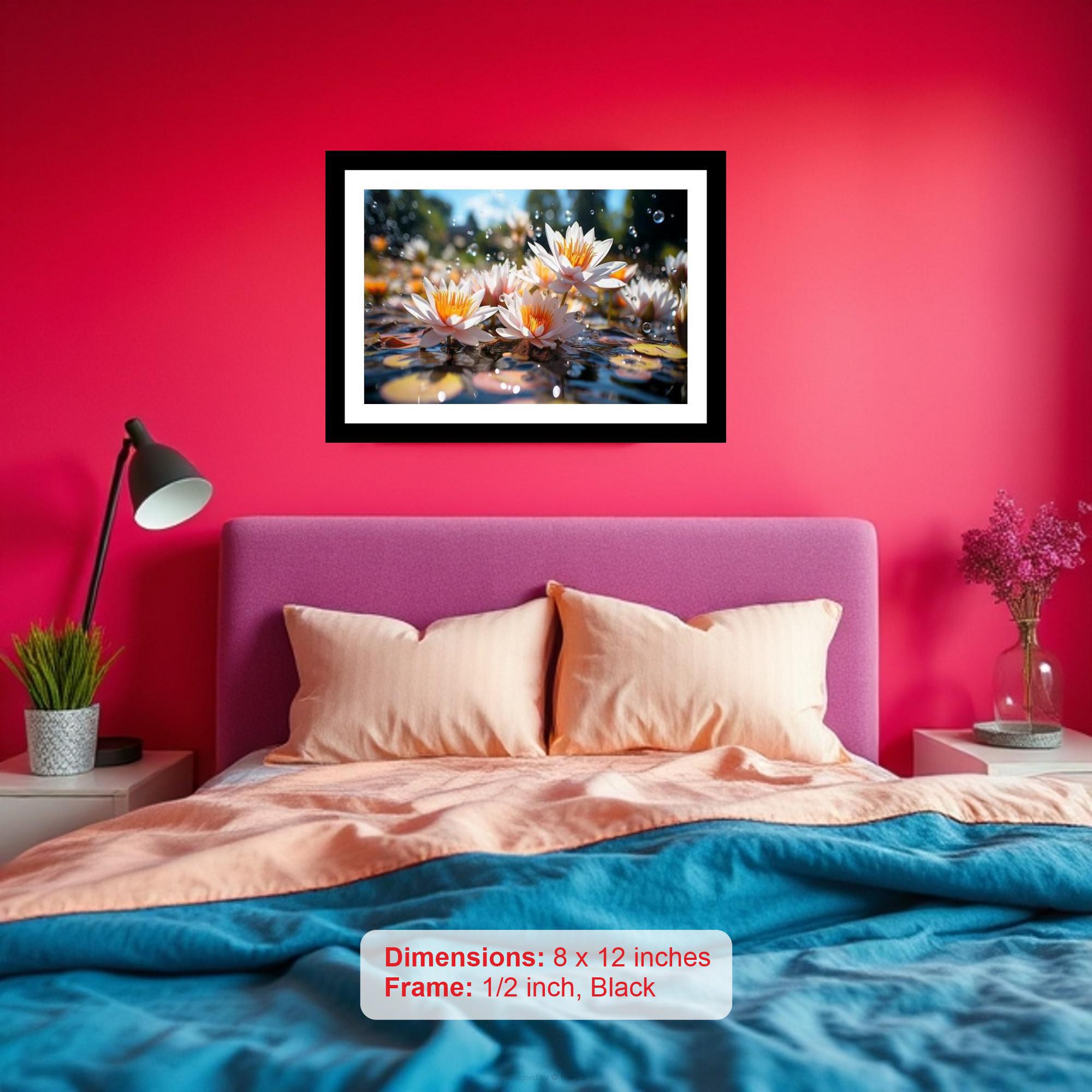 A serene water lily photo: vibrant blooms pop against a tranquil surface, a captivating contrast of color and calm. The colors pop and the detail is crisp - a true testament to the original photograph's beauty. The digital reprint boasts a striking composition, breathing new life into the photograph's captivating beauty. Versatile Decor: Ideal for enhancing the aesthetic appeal of living rooms and bedrooms Enhanced Durability: Weather-shield laminated digital print for lasting vibrancy and protection Premium Framing: Constructed with a high-quality, durable fiber frame for long-term stability Precise Dimensions: 30 cm x 20 cm x 1 cm