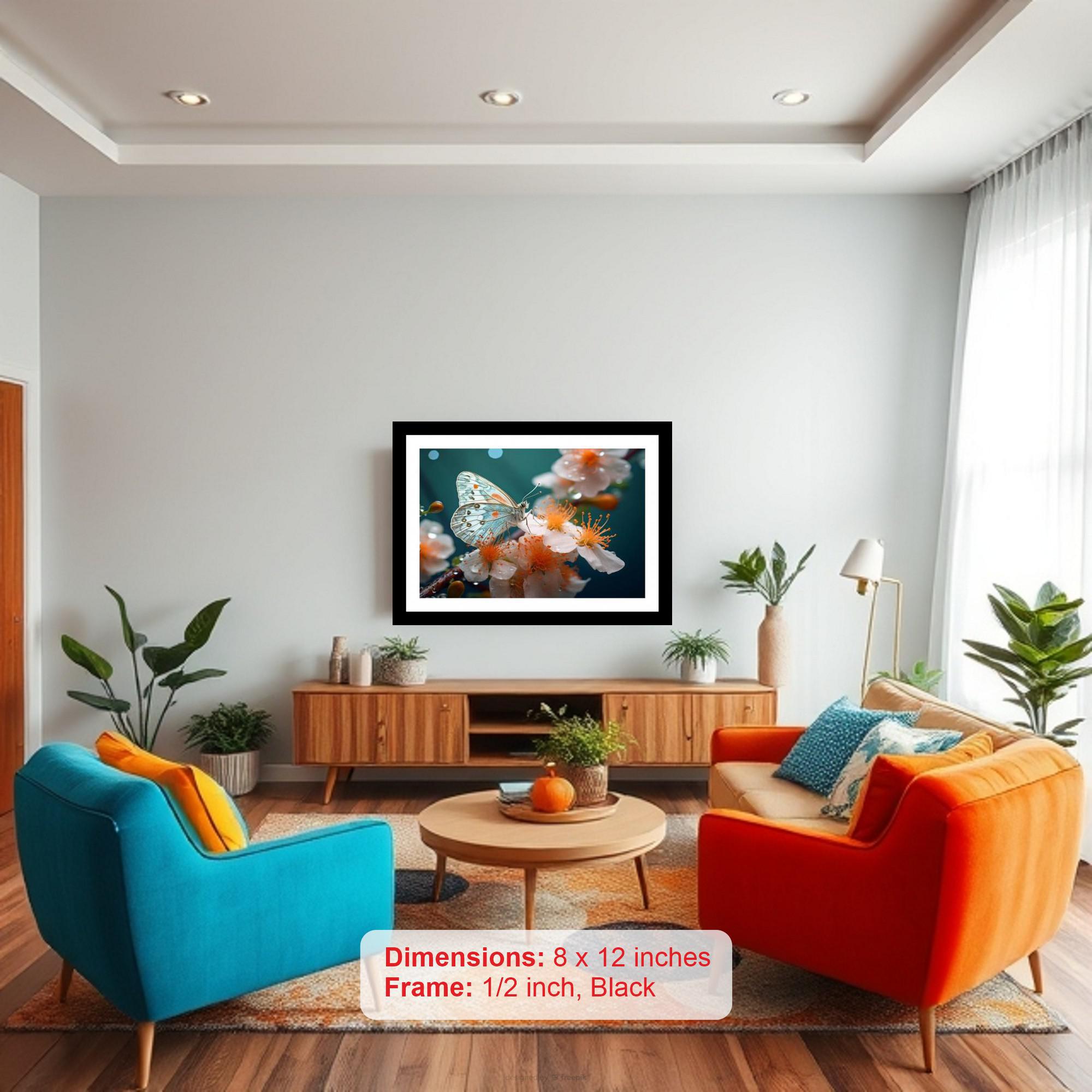 Capture timeless beauty with this vintage-inspired digital reprint, elegantly framed in a golden hue. The artwork showcases a delicate, light-blue butterfly gracefully perched upon a cluster of blossoms, their petals adorned with glistening dewdrops. This piece evokes a sense of tranquility and natural wonder, perfect for adding a touch of vintage charm and sophistication to any living space. The black frame complements the soft colors of the image, creating a cohesive and visually appealing aesthetic. Whether displayed in your living room, bedroom, or study, this framed reprint will serve as a captivating focal point, sparking conversation and admiration. Its timeless appeal makes it an ideal gift for art enthusiasts, nature lovers, or anyone seeking to infuse their home with a touch of classic elegance.
