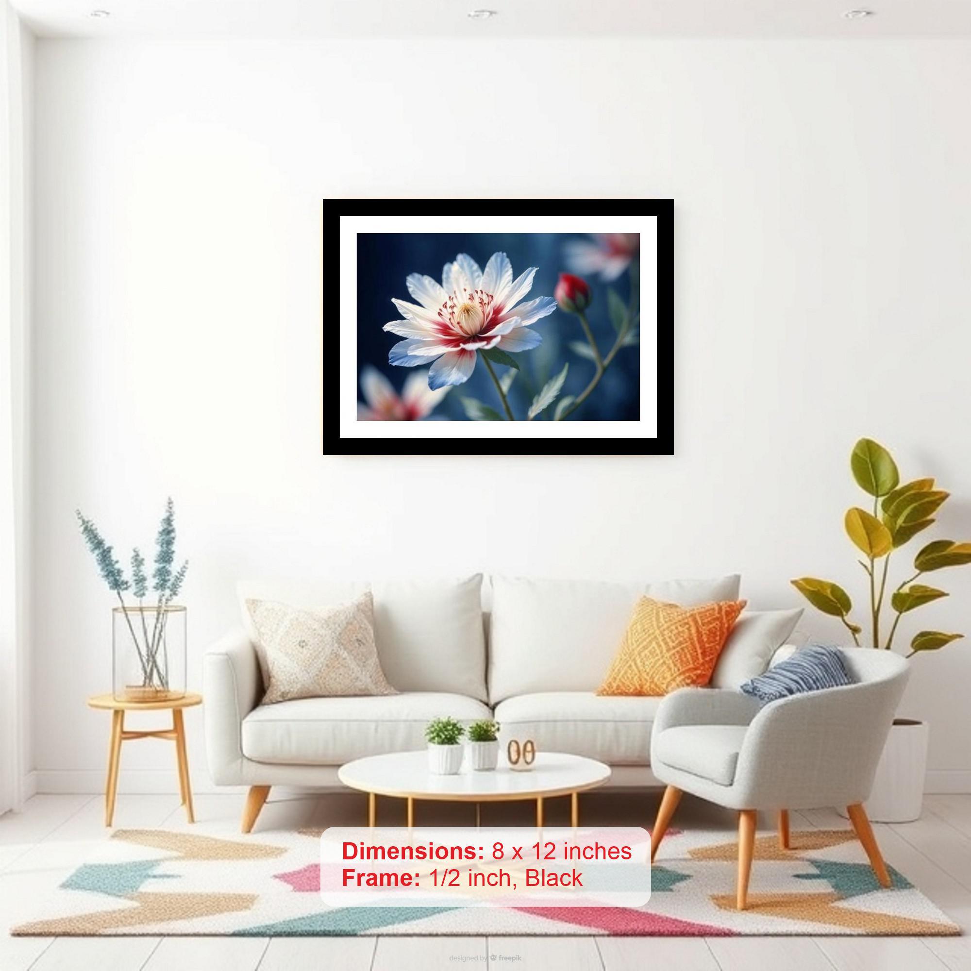 Adorn your space with timeless beauty! This vintage-inspired digital reprint showcases a captivating photograph of a delicate white and red flower in full bloom, bathed in a soft, ethereal light. The elegant black frame adds a touch of classic sophistication, perfectly complementing the floral artistry within. This piece evokes a sense of serenity and natural grace, making it a stunning focal point for any room. Its subtle colors and gentle composition blend seamlessly with various decor styles, from traditional to modern. Elevate your home or office with this exquisite artwork, a lasting testament to nature's beauty captured in a moment of perfect light. A sophisticated and charming addition that brings a touch of refined elegance to any wall.