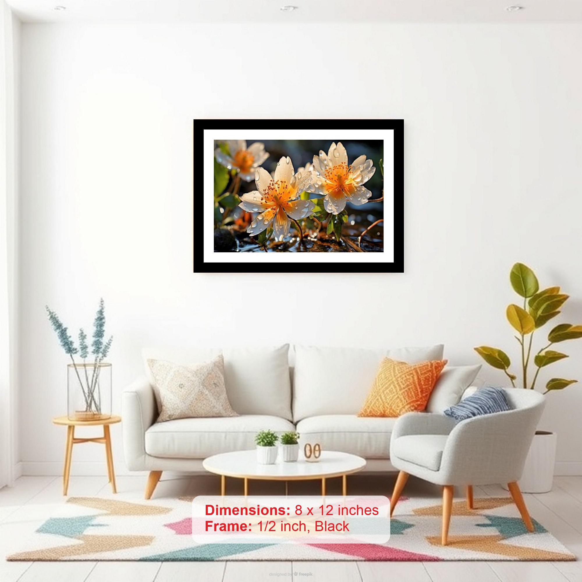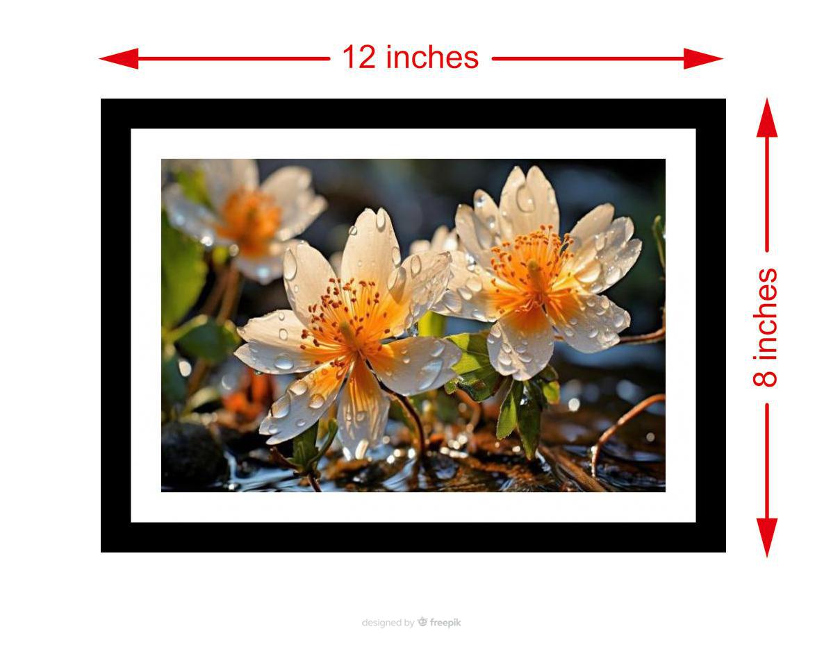 A stunning image capturing the vibrant beauty of dew-kissed flowers thriving by the water's edge. The colors are vibrant, and the print captures every detail of the original photograph beautifully. The reprint's striking composition breathes new life into the photograph, making it a digital masterpiece. Versatile Decor: Ideal for enhancing the aesthetic appeal of living rooms and bedrooms Enhanced Durability: Weather-shield laminated digital print for lasting vibrancy and protection Premium Framing: Constructed with a high-quality, durable fiber frame for long-term stability Precise Dimensions: 30 cm x 20 cm x 1 cm