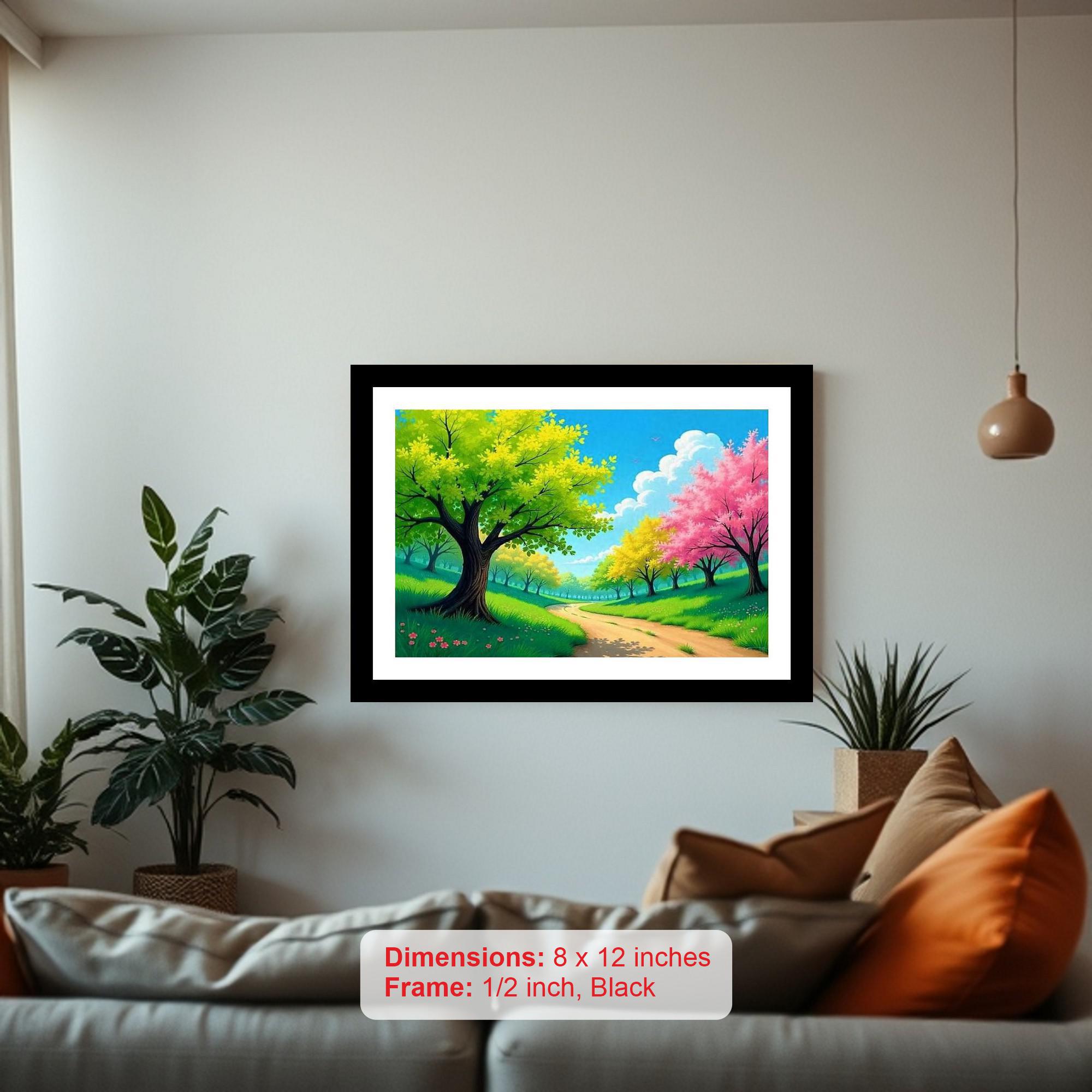 Elevate your home decor with this elegantly framed digital reprint, showcasing a captivating landscape scene that seamlessly blends the essence of all seasons. A winding path or road gently guides the eye through lush greenery, evocative of spring and summer's vibrant life. The trees, painted with meticulous detail, stand as silent sentinels, their foliage hinting at the fiery hues of autumn. Delicate flowers, scattered throughout the composition, add a touch of romantic charm. The classic black frame provides a sophisticated border, enhancing the artwork's timeless appeal and making it a versatile addition to any room. Immerse yourself in the tranquility of nature and bring the beauty of the outdoors inside with this exquisite piece of art.